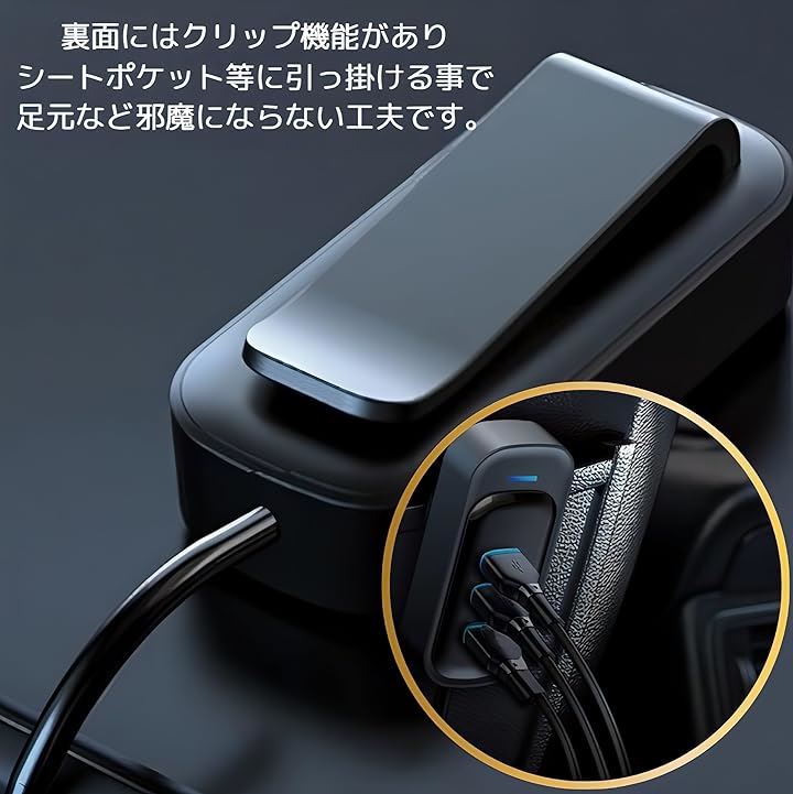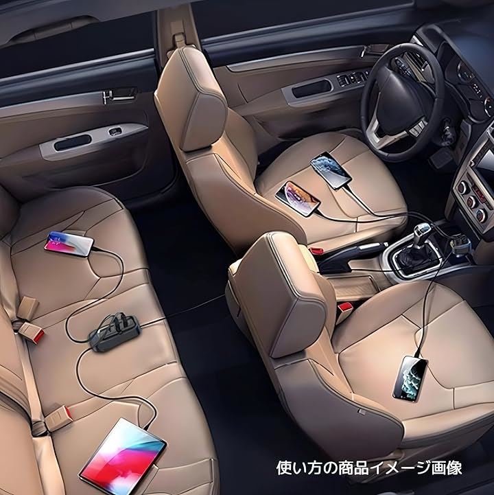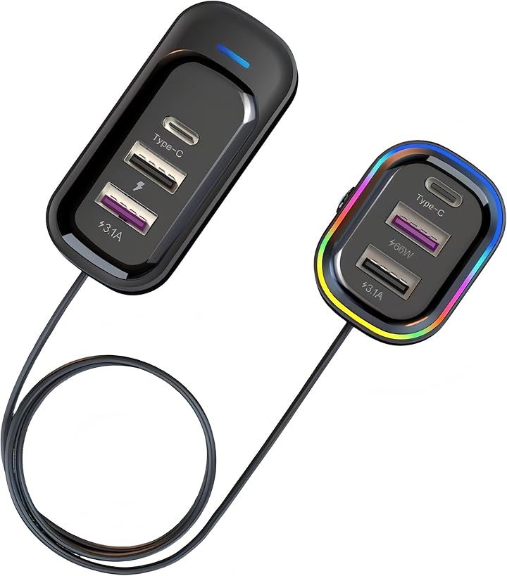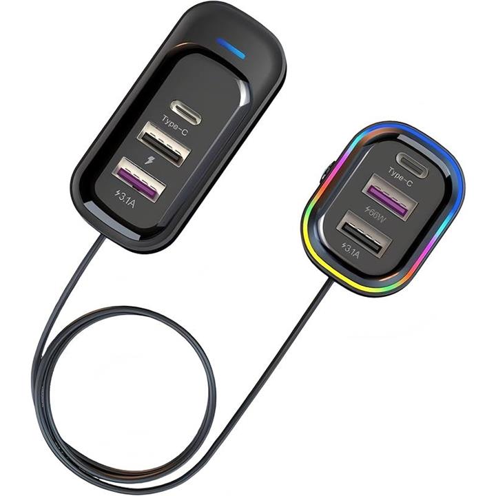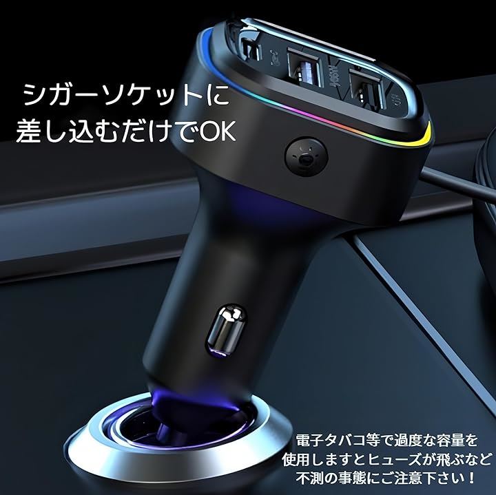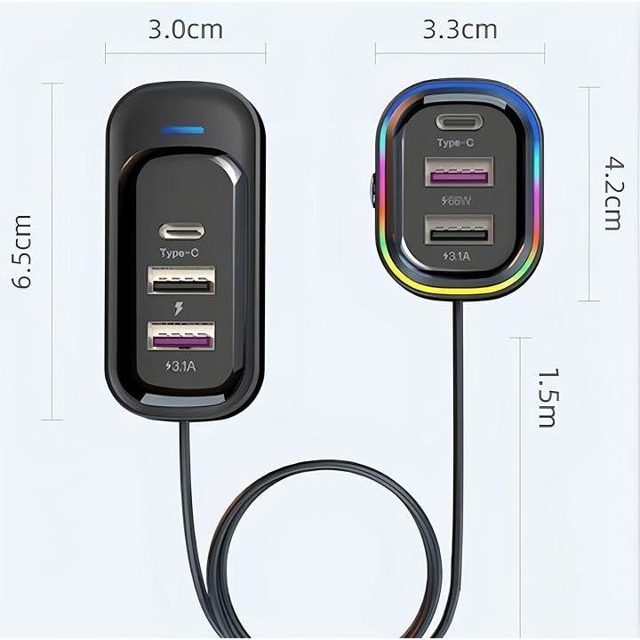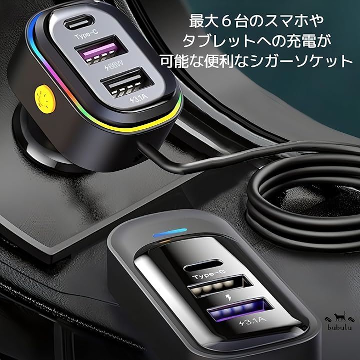 車用シガーソケット充電器 66W USB Type-C & USB-A 急速充電ポート アンビエントライト付き 1.5m延長ケーブル 12V/24V対応