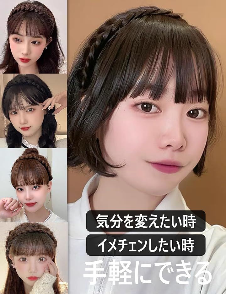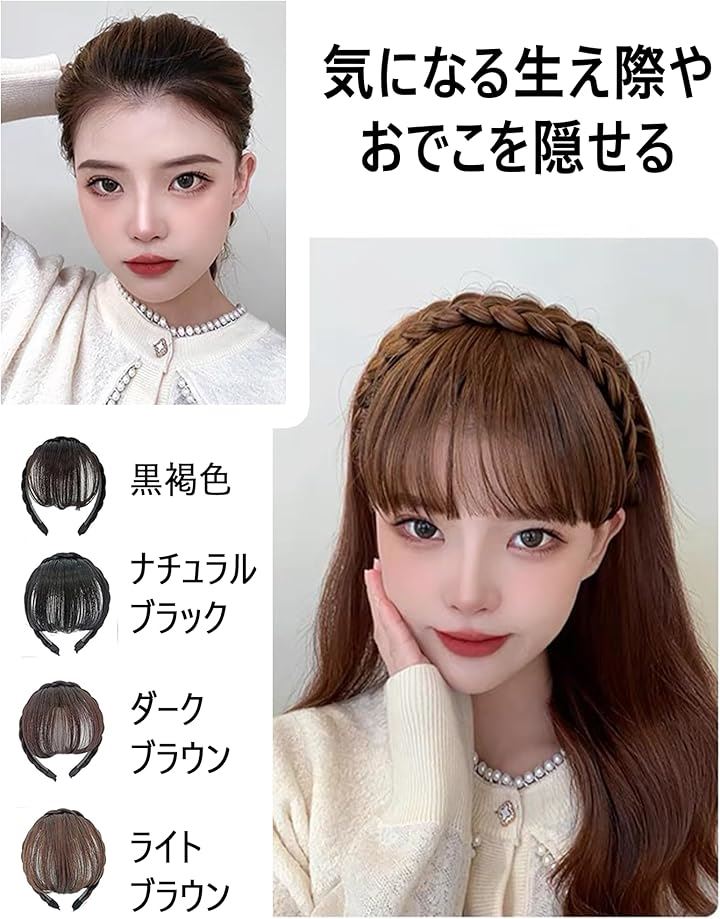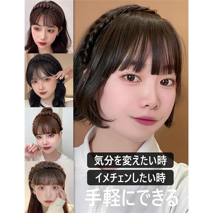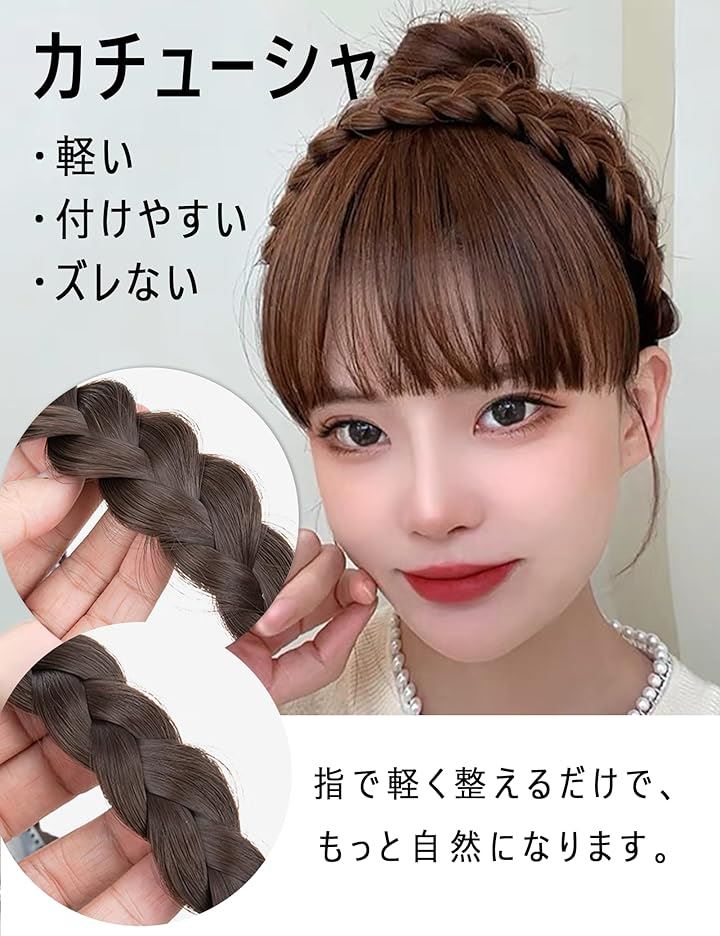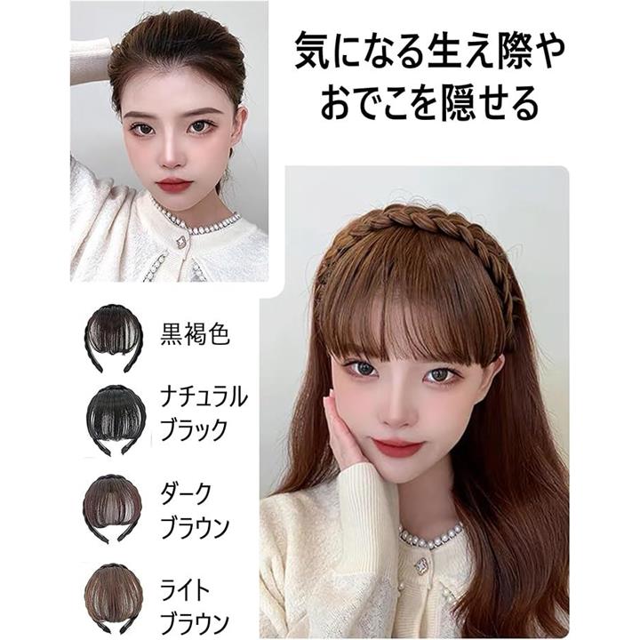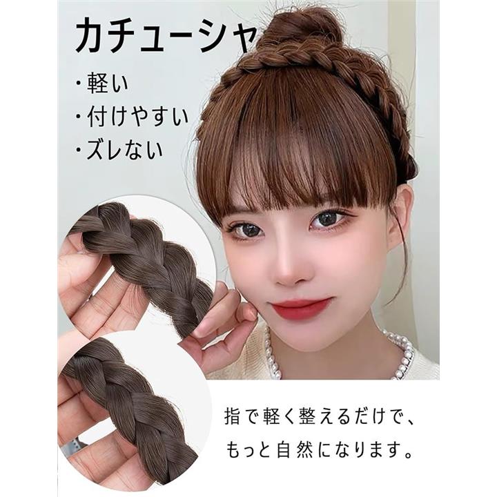 カチューシャ 前髪ウィッグ ぱっつん 重め 三つ編み 総手植え 部分ウィッグ 自然な仕上がり 学園祭 文化祭 通学用 日常 コスプレ