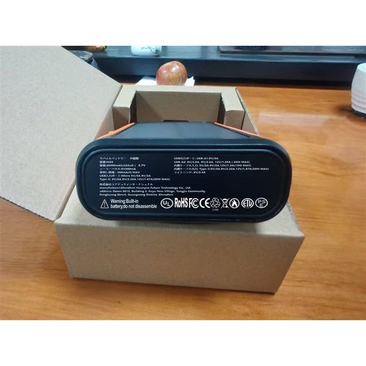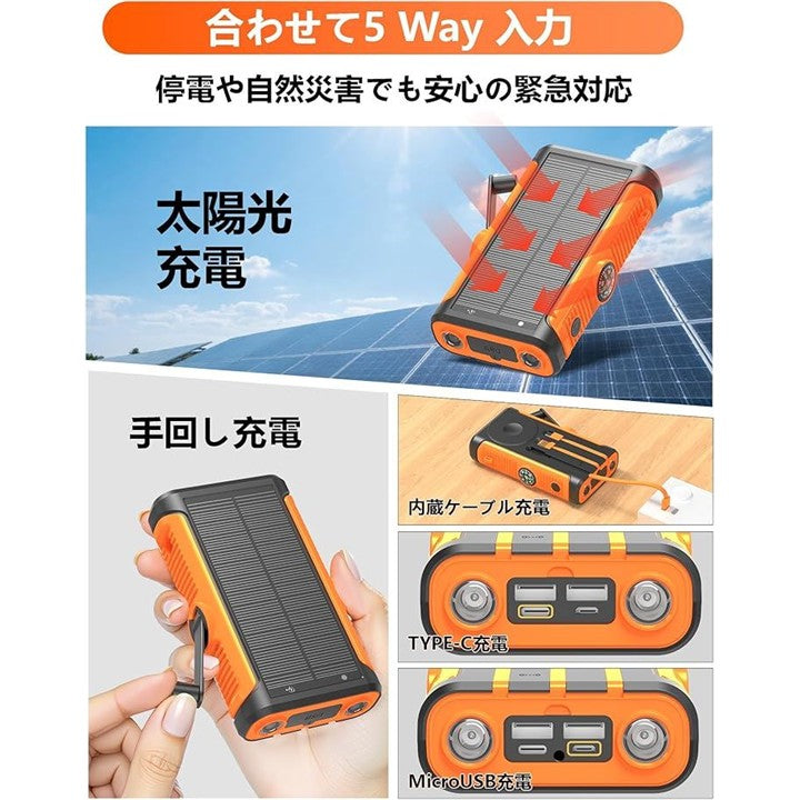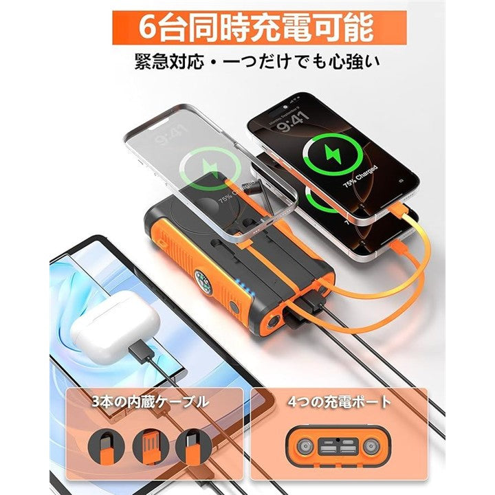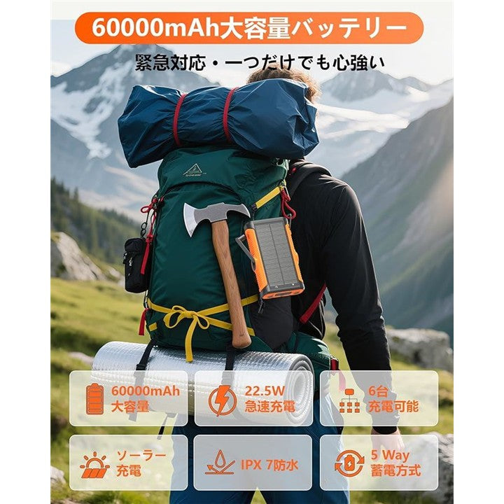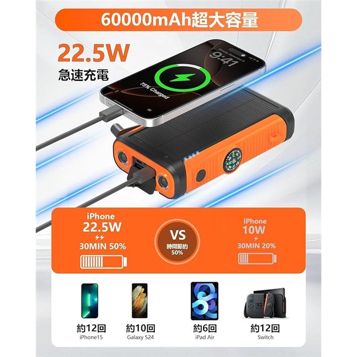 ソーラーモバイルバッテリー 60000mAh大容量・22.5W/222Wh・6台同時充電 5way蓄電 手回し充電 ソーラーチャージャー ソーラー充電器 4ポート搭載 3本ケーブル内蔵