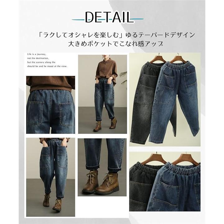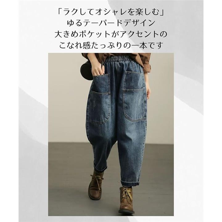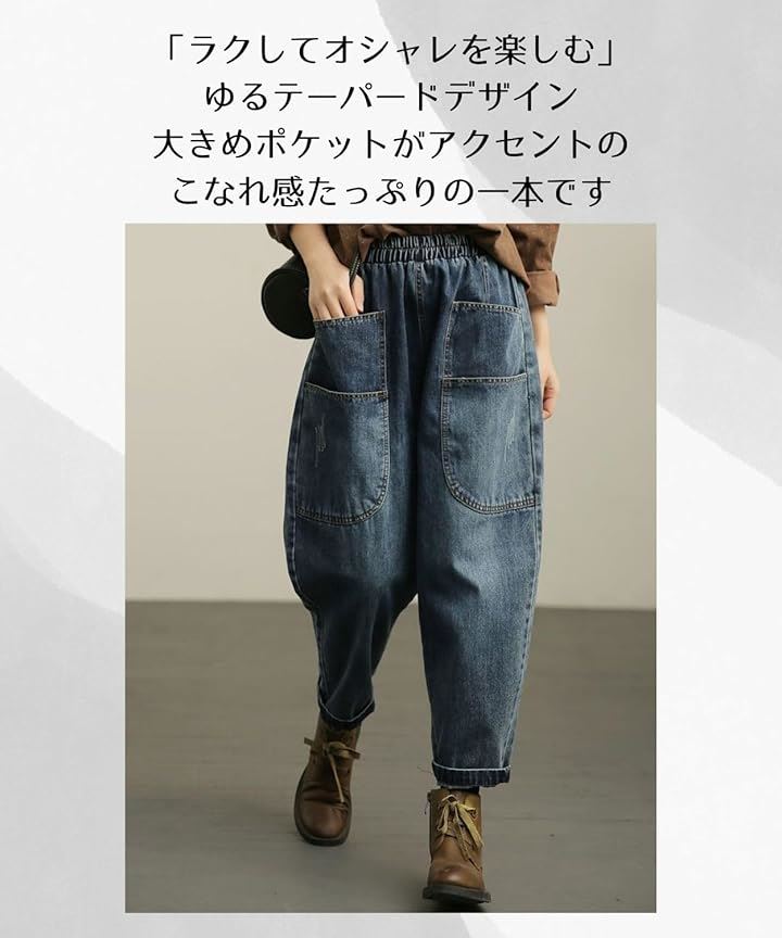 ゆったりとした腰回りとテーパードラインが特徴のハイウエストデニムパンツレディース。