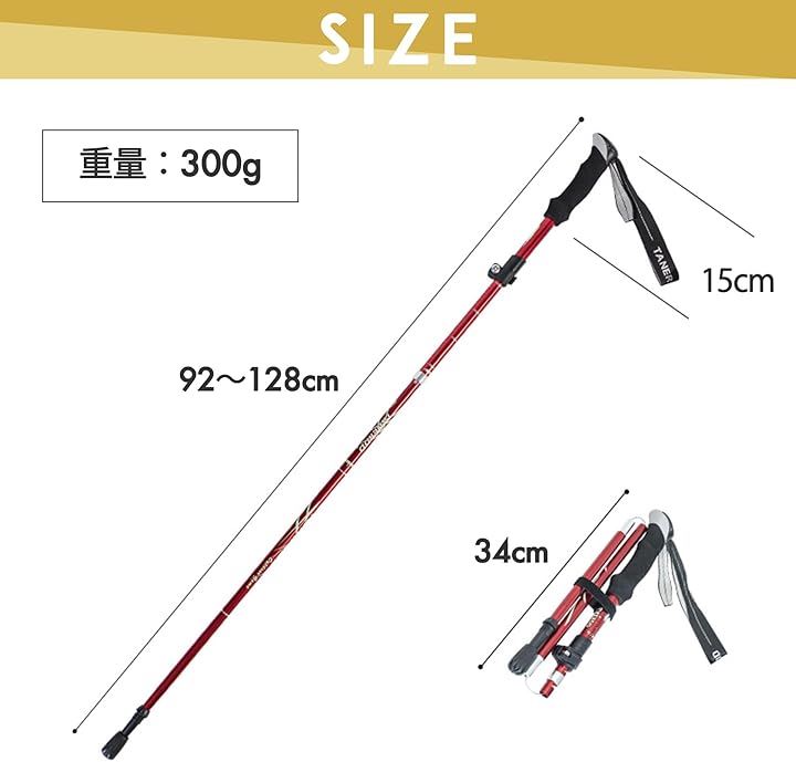 「コンパクト収納」1本格納で 3本に折りたためる4段折式 で、収納時は、約300グラムの軽量、わずか約34cmに たたんで持ち運べます。