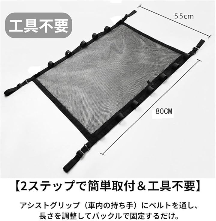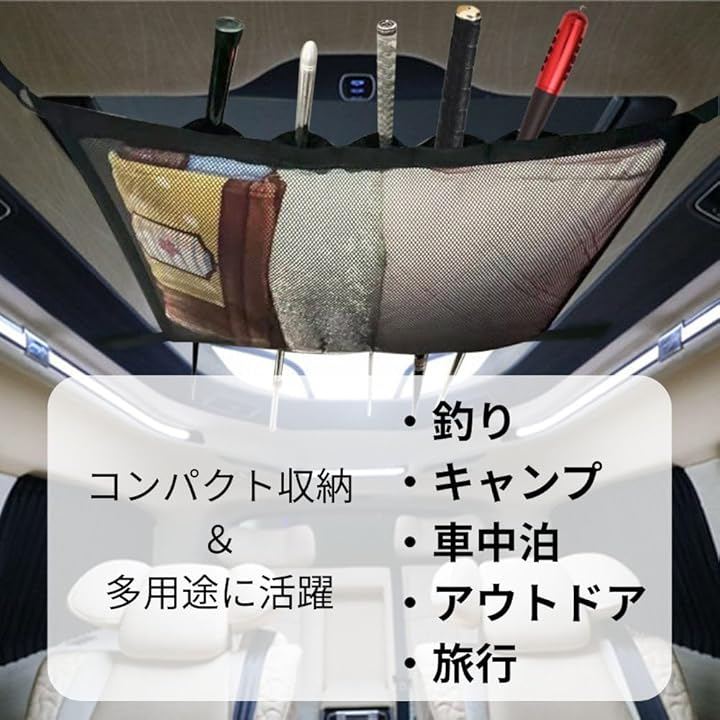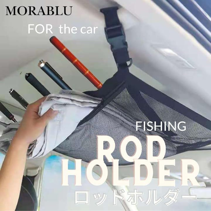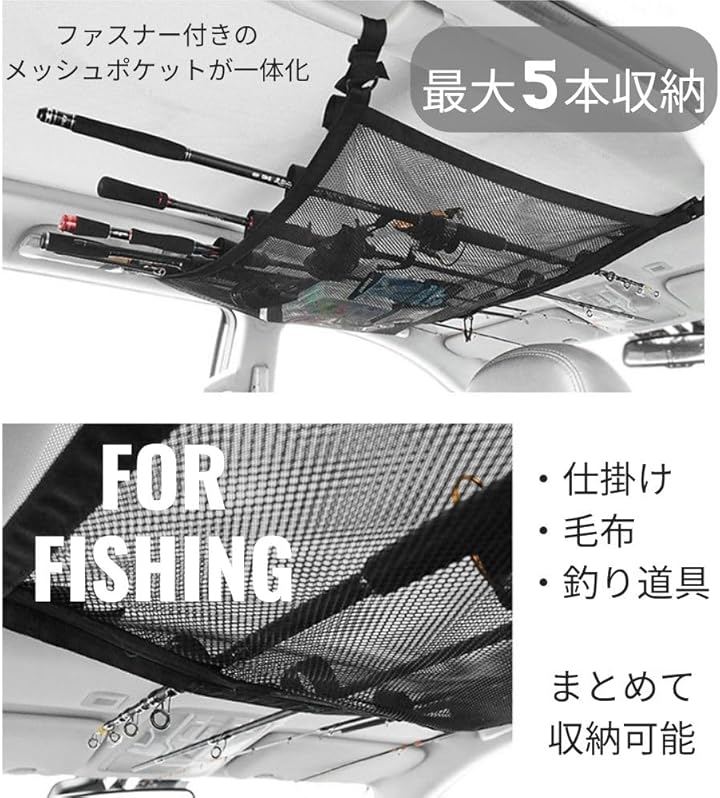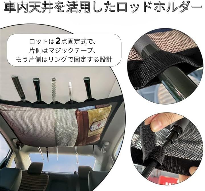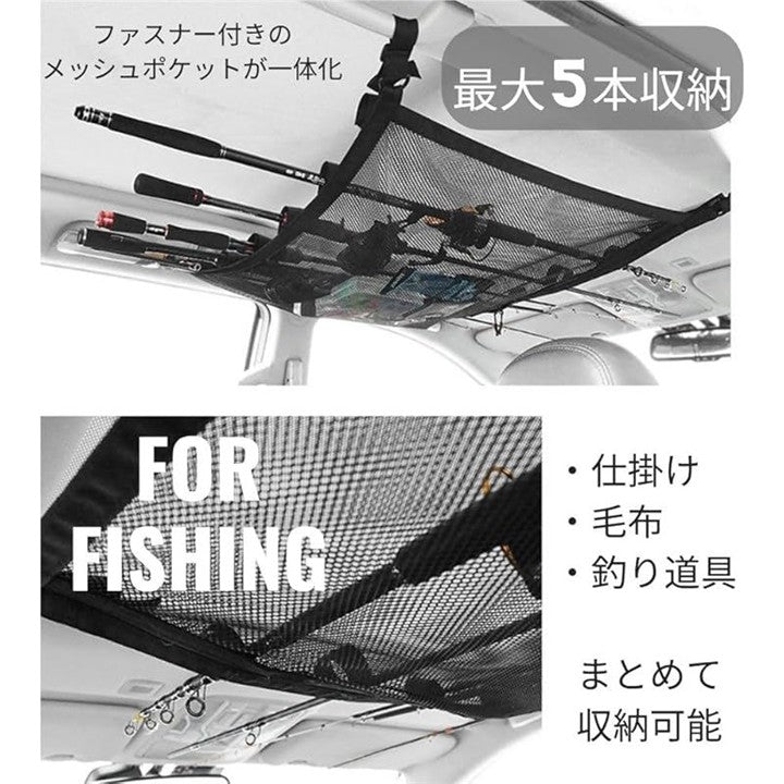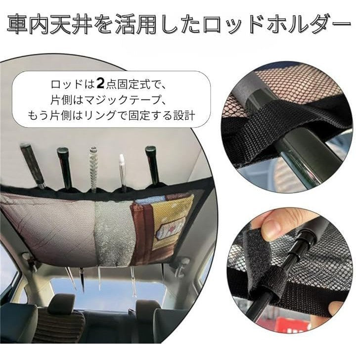 ロッドホルダー 車用 車載 天井 釣り竿ホルダー 5本収納 メッシュ付き 釣り道具 収納ベルト