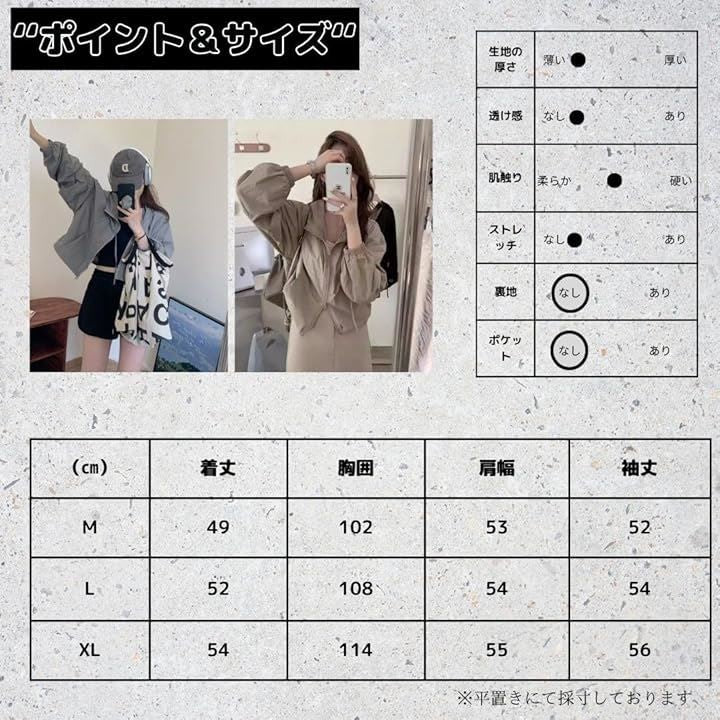 「素材」ナイロン「カラー」グレー/ブラック/ダークカーキ 「サイズ」M/L/XL M:着丈49cm/胸囲102cm/肩幅53cm/袖丈52cm L:着丈52cm/胸囲108cm/肩幅54cm/袖丈54cm XL:着丈54cm/胸囲114cm/肩幅55cm/袖丈56cm 詳細は写真をご覧ください。
