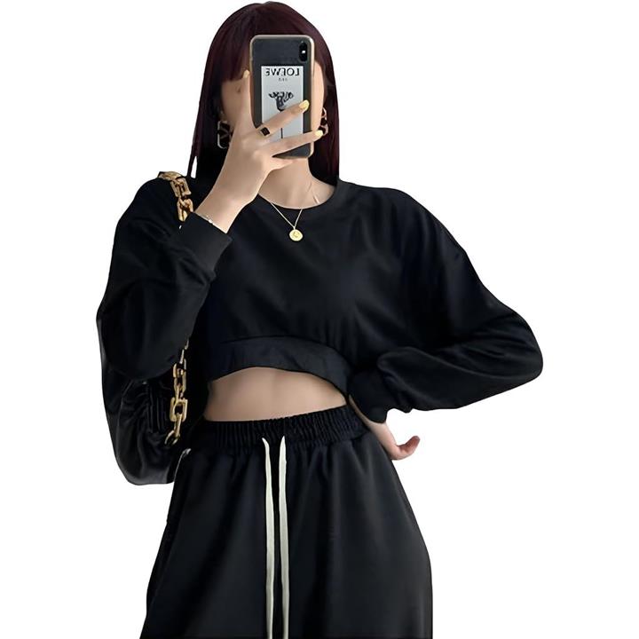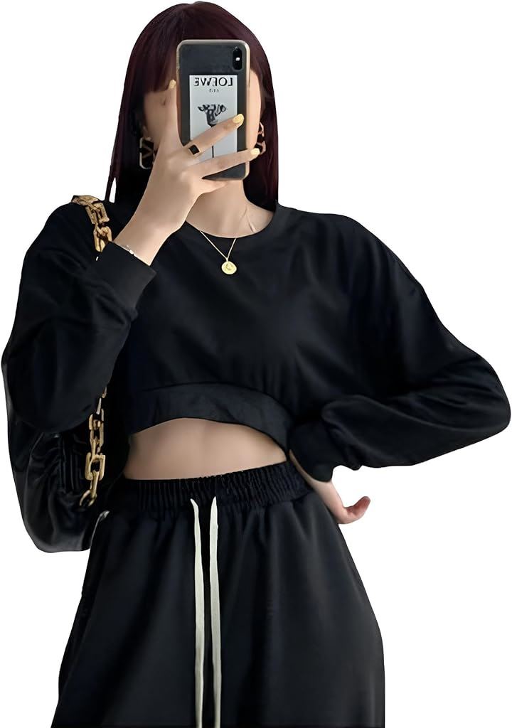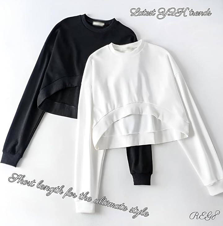 レディース ショート丈 スウェット トレーナー 長袖 プルオーバー 丸首 ゆったり ストリート 無地 シンプル 着痩せ 韓国ファッション 春 秋 冬