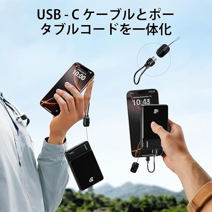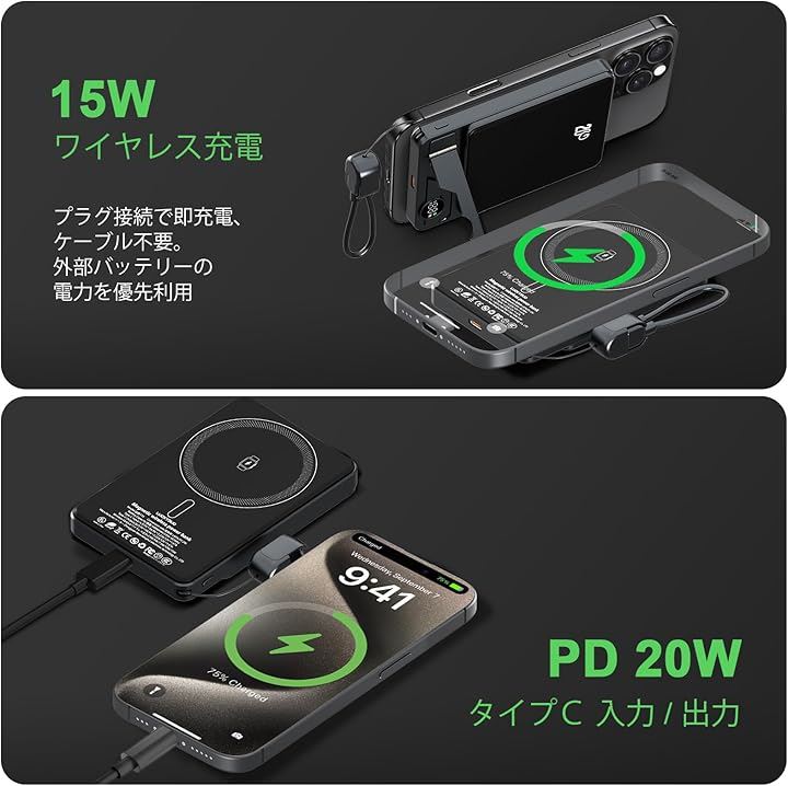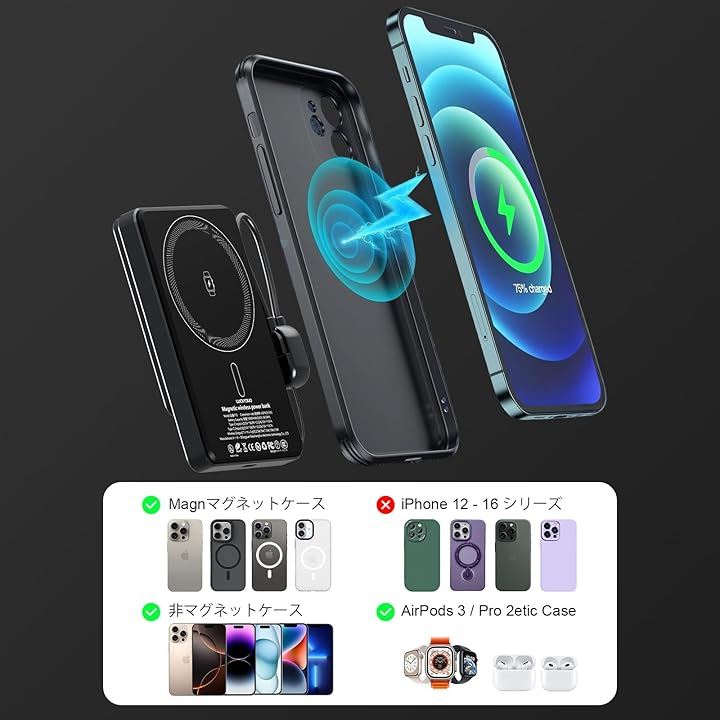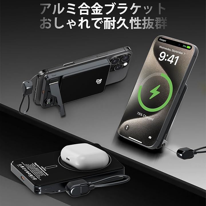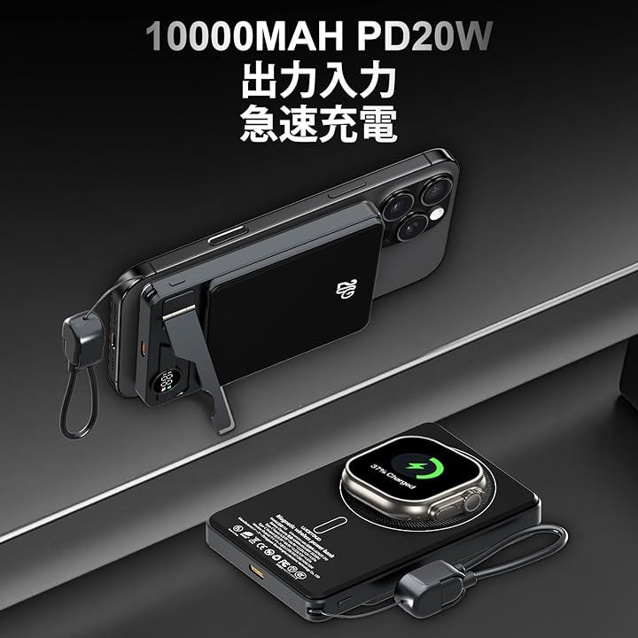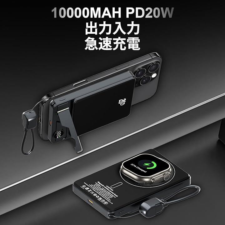 新登場 3in1 Magon モバイルバッテリー 軽量 10000mAh 1.1cm薄型 マグセーフ マグネット式 ワイヤレス充電対応 PD20W急速充電 2台同時充電可能