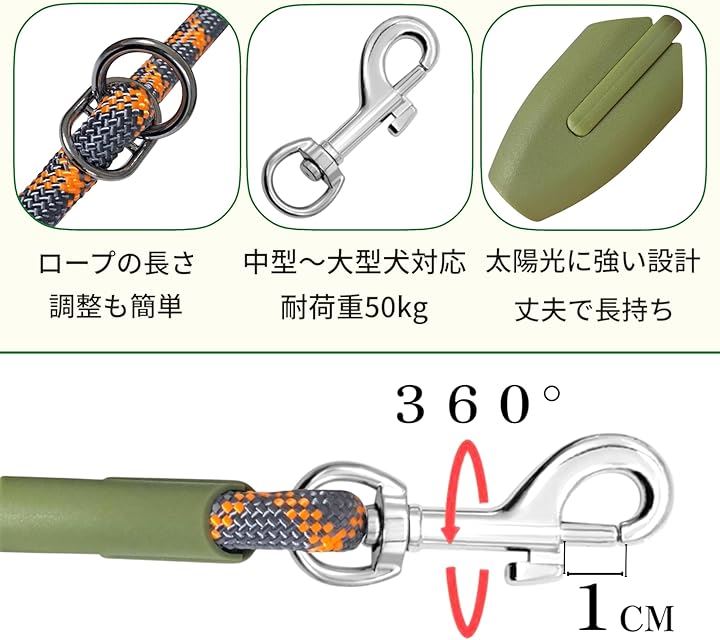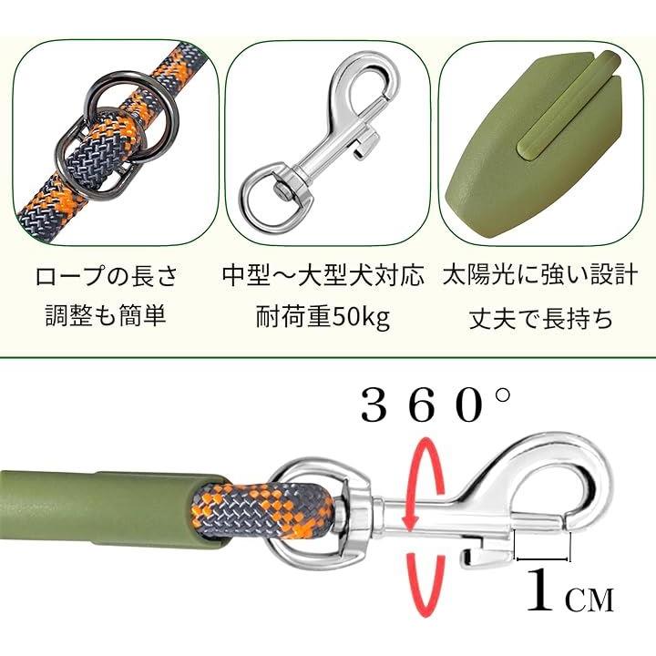 丈夫で絡まりにくい構造:高強度ナイロン素材と360度回転する金具を採用し、動き回る犬でもリードが絡みにくい仕様。
