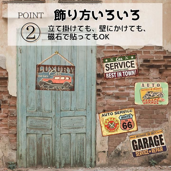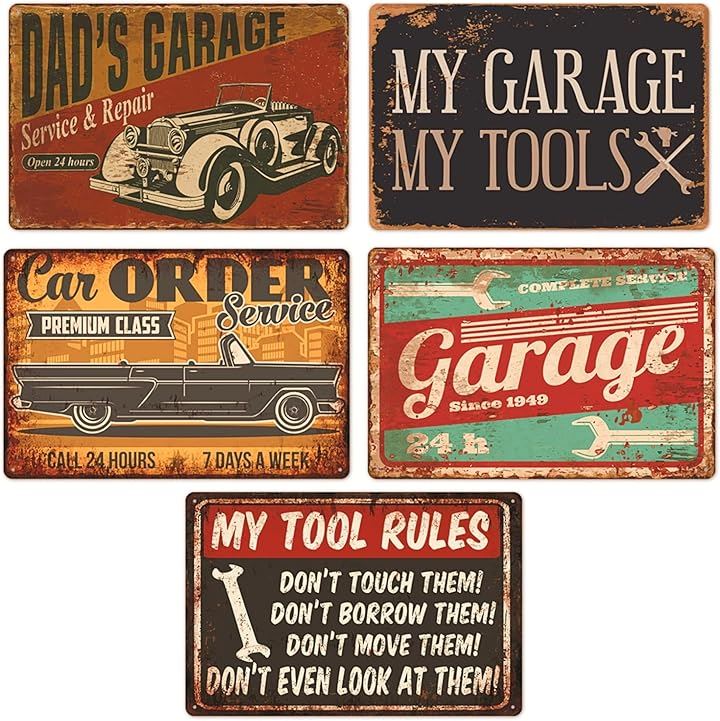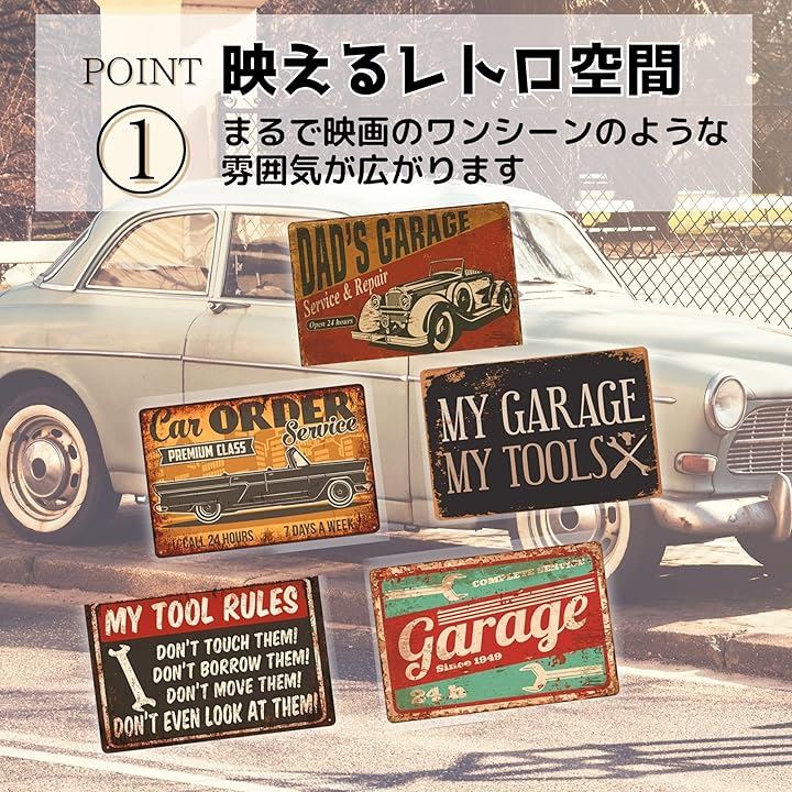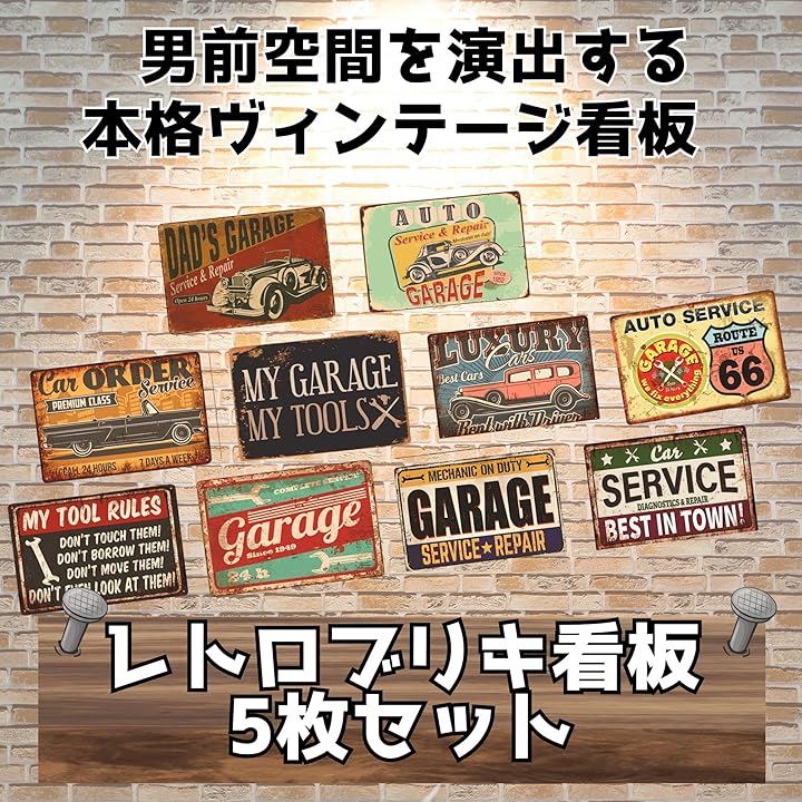 ブリキ看板 5枚セット アメリカンガレージ レトロカー クラシックカー 車庫 ヴィンテージ サインプレート 男前空間 西海岸スタイル カフェ風 DIY装飾 アメ車好き必見