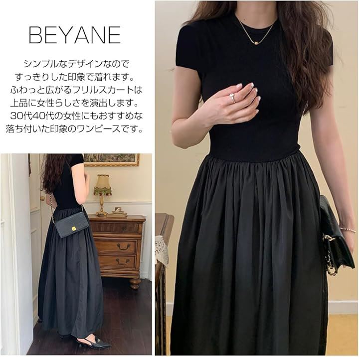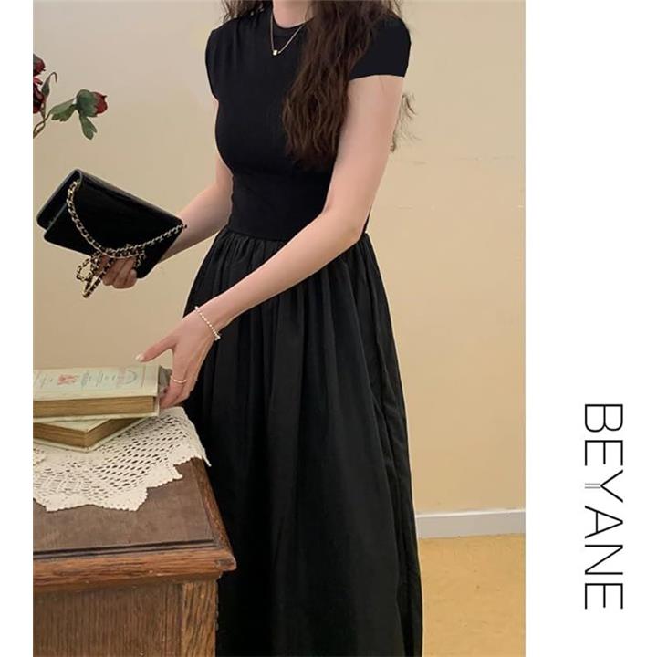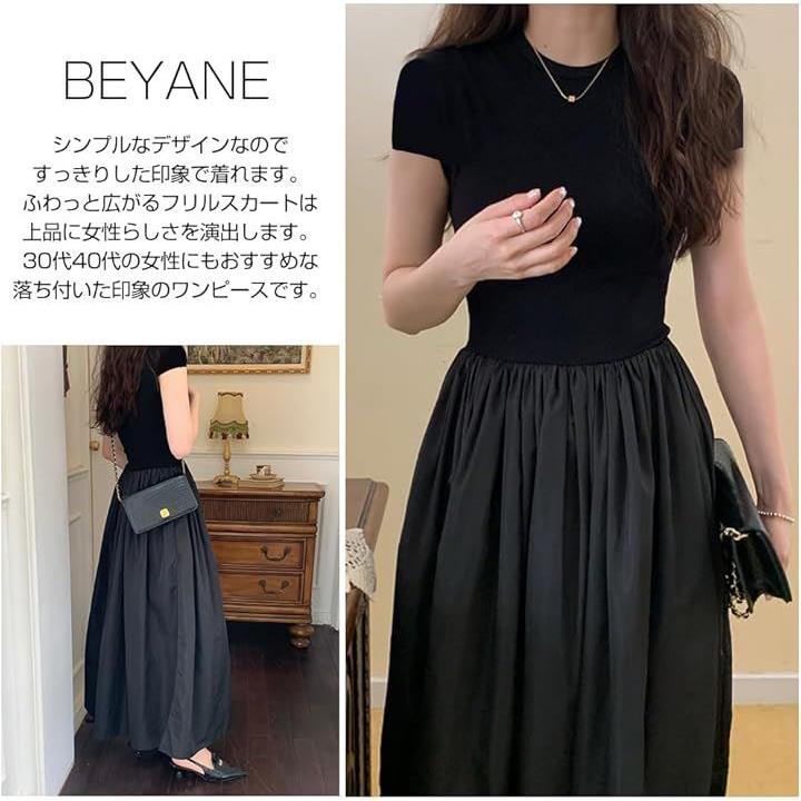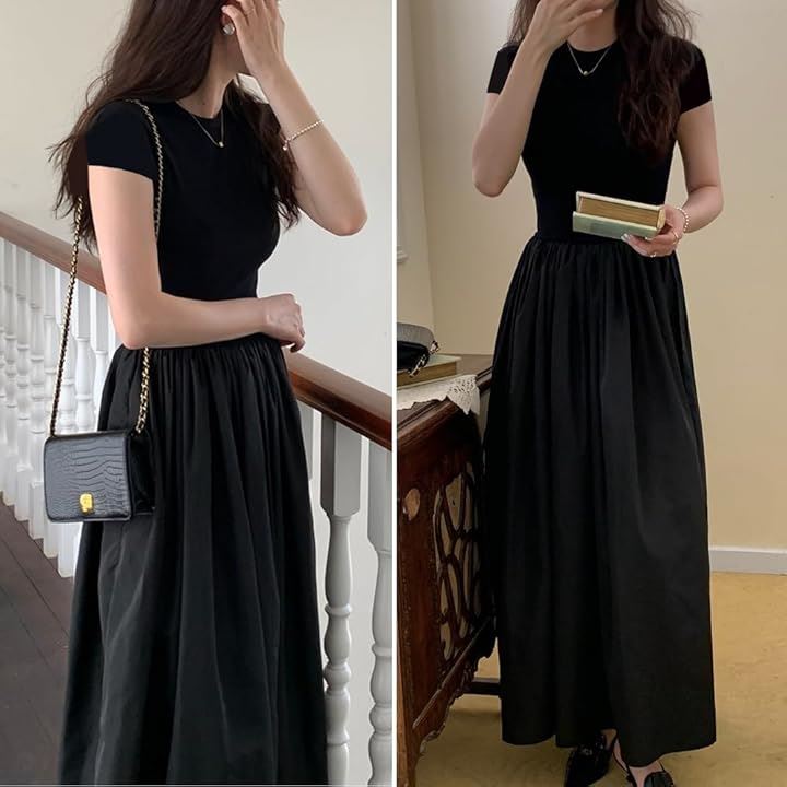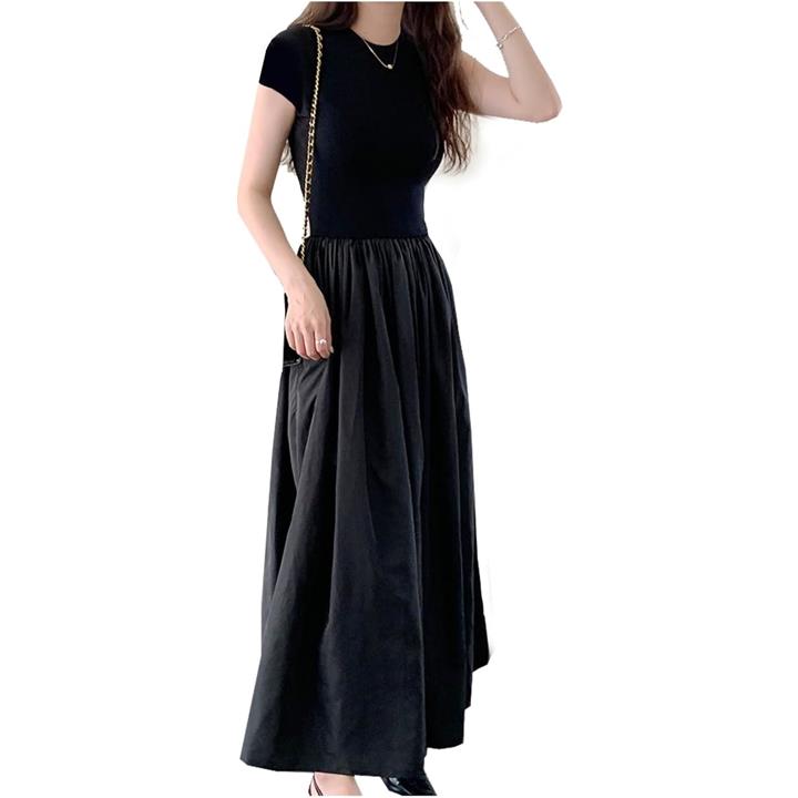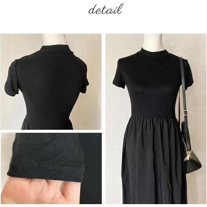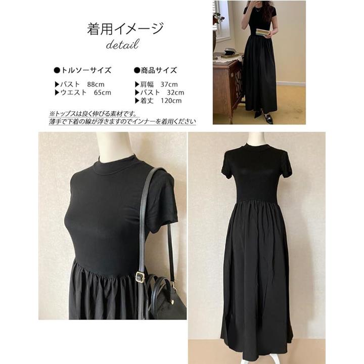 レディース 夏 ワンピース 大人かわいい ロング ウエストマーク きれいめ フレンチ フレア 韓国 ファッション 黒 ロングワンピース 半袖 上品 ロングスカート