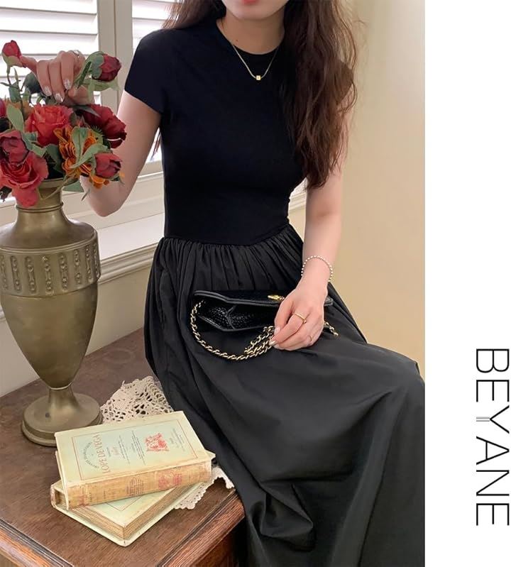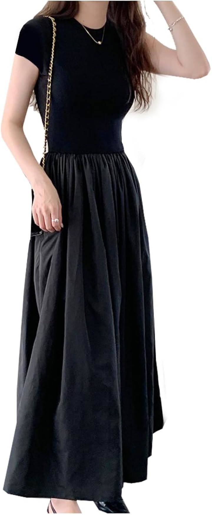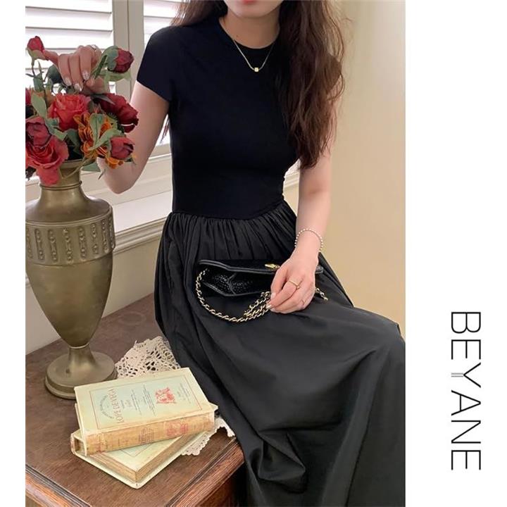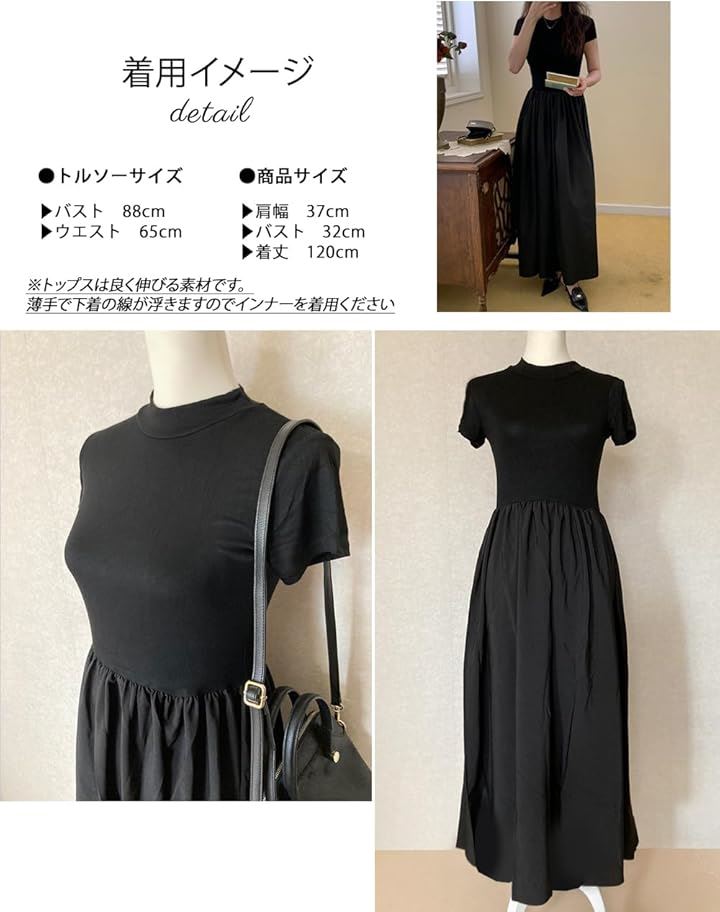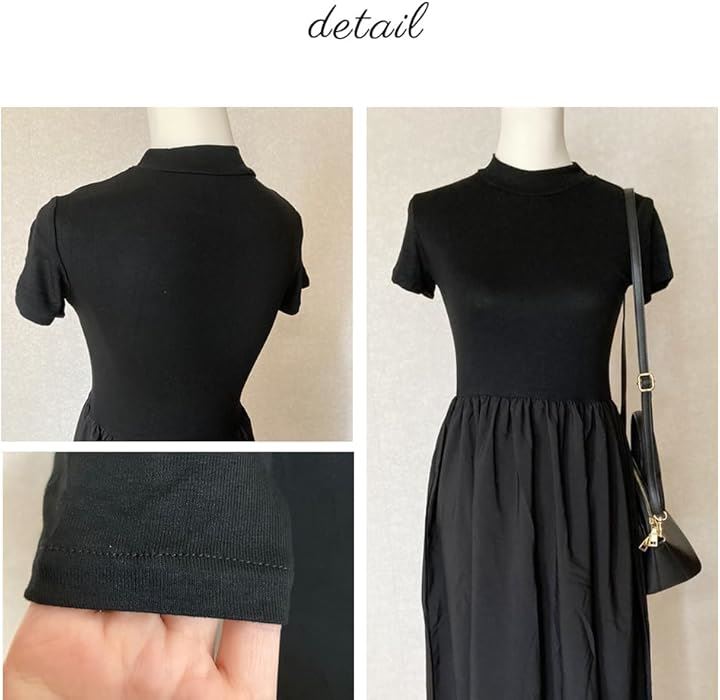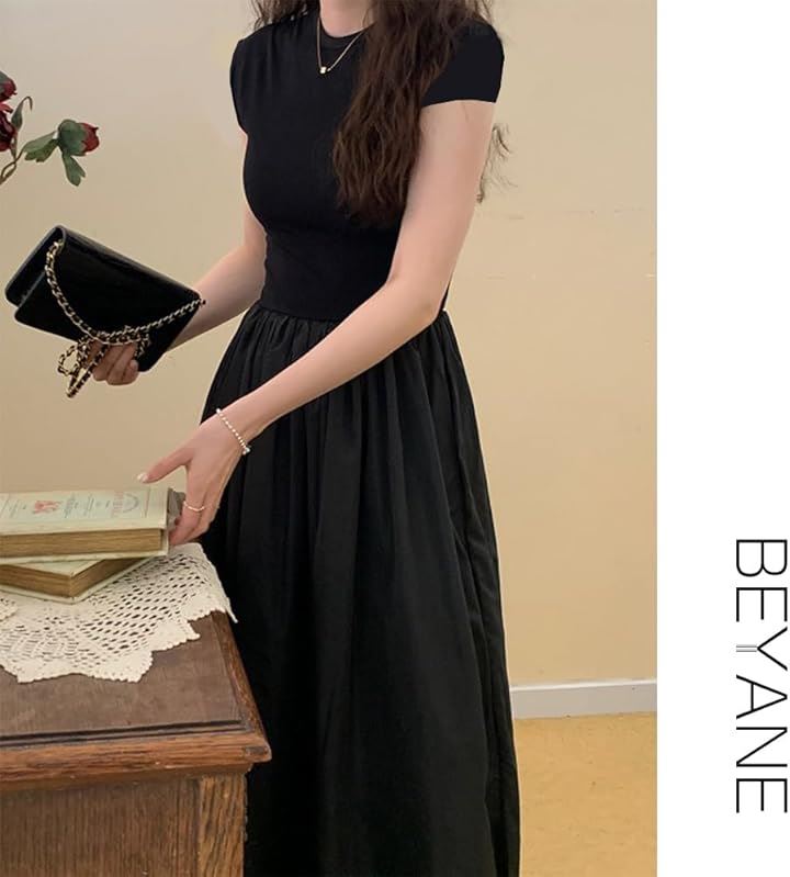 レディース 夏 ワンピース 大人かわいい ロング ウエストマーク きれいめ フレンチ フレア 韓国 ファッション 黒 ロングワンピース 半袖 上品 ロングスカート