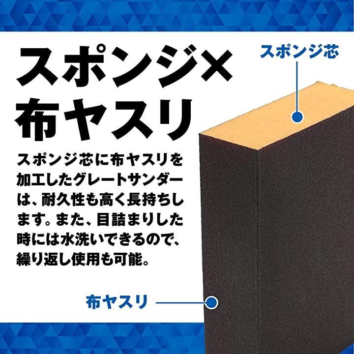 ・「4面使用可能で経済的」耐久性が高い布ヤスリを使用している上に4面を使用することができるので、とっても長持ち。目詰まりした時には歯ブラシなどでも目詰まりをある程度取り除くことができ、水洗いも可能です。