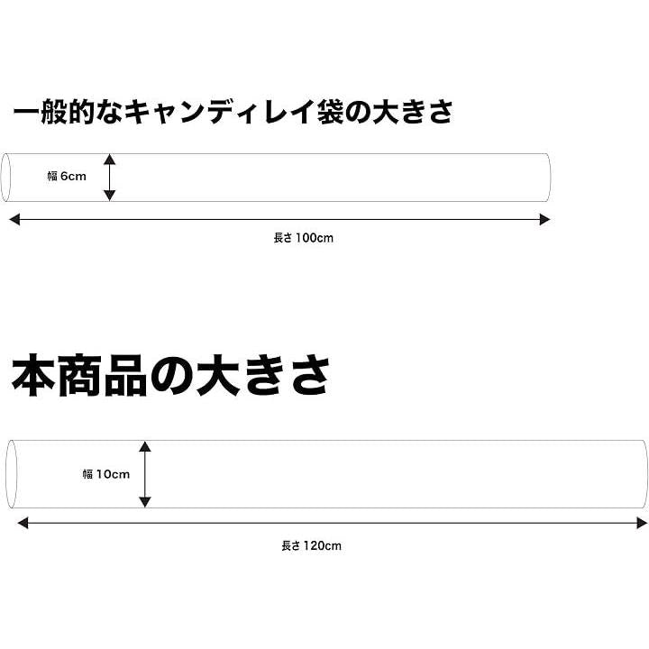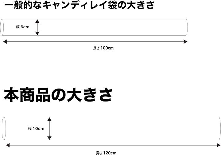 キャンディレイ用チューブ袋は、幅10cm・長さ120cmの大きいサイズで、ファミリーパックのお菓子やスナック、クッキーなども余裕で入る大容量が魅力です。