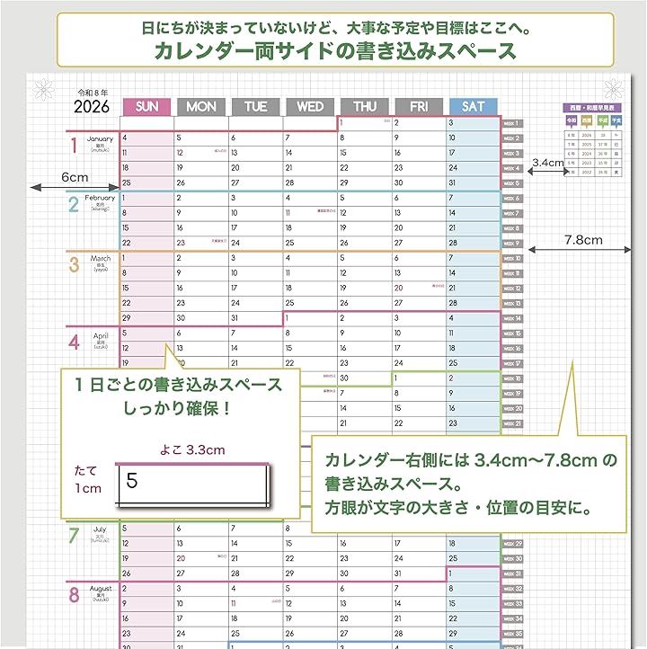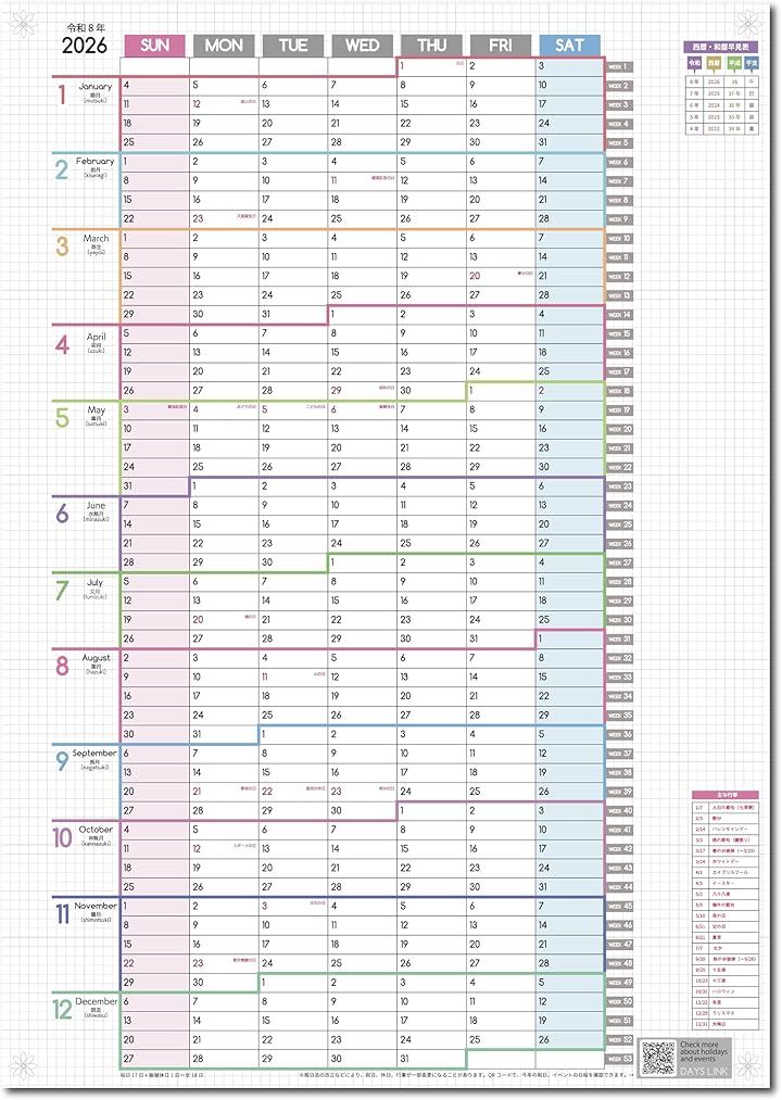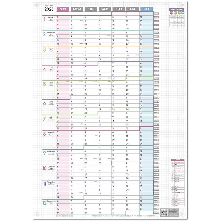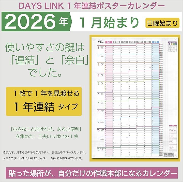 1年連結カレンダー ポスター 1枚 2026年 1月始まり 日曜始まり 大きい 壁掛け 令和8年 M1-26-1-SUN