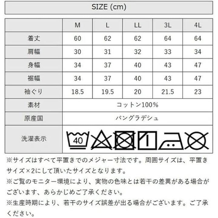 「サイズ」 「Mサイズ 着丈:60cm 肩幅:30cm 身幅:34cm 裾幅:34cm 袖ぐり:18.5cm」 「Lサイズ 着丈:62cm 肩幅:31cm 身幅:37cm 裾幅:37cm 袖ぐり:19.5cm」 「LLサイズ 着丈:62cm 肩幅:32cm 身幅:40cm 裾幅:40cm 袖ぐり:20cm」 「3Lサイズ 着丈:64cm 肩幅:33cm 身幅:43cm 裾幅:43cm 袖ぐり:21.5cm」 「4Lサイズ 着丈:64cm 肩幅:34cm 身幅:47cm 裾幅:47cm 袖ぐり:23cm」 *全部でM、L、LL、3L、4L、充実の5サイズ展開。