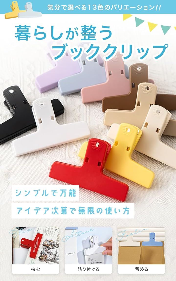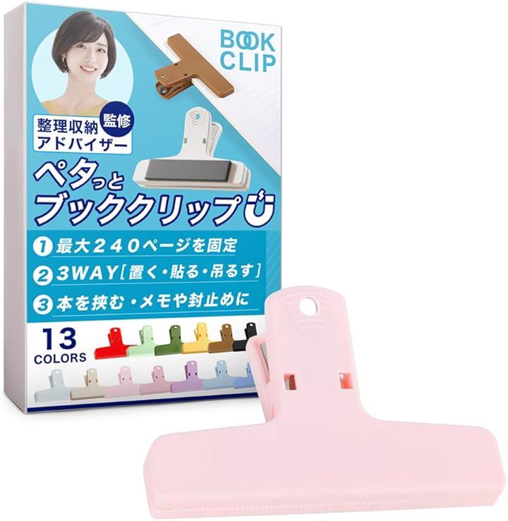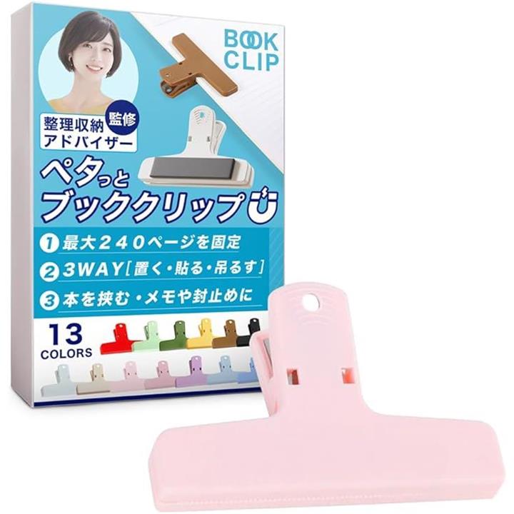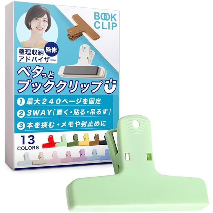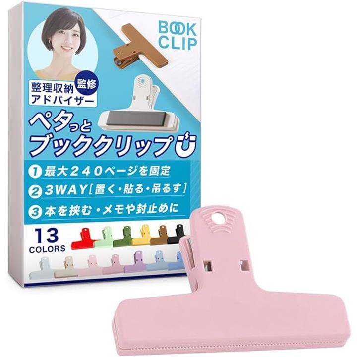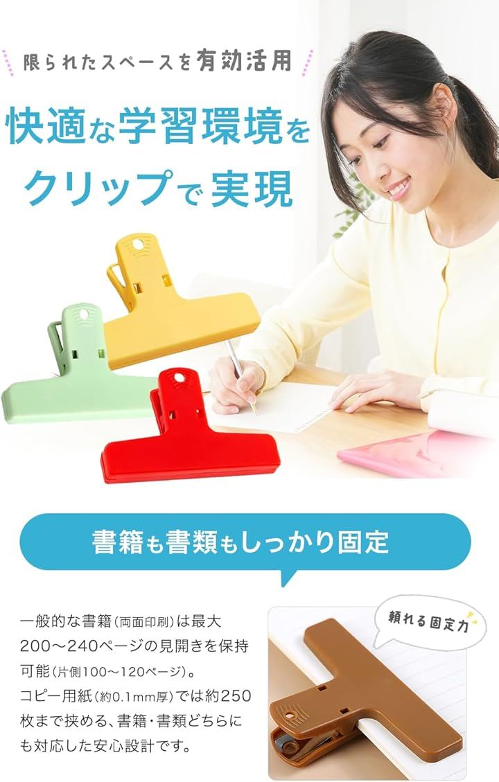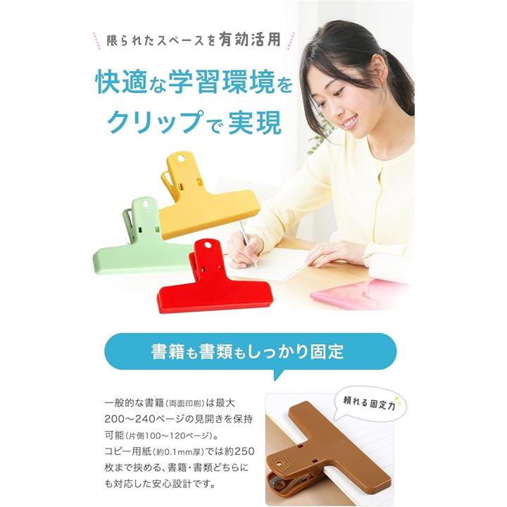 メモや封止めにも使える多用途設計」厚みのある本のページ固定はもちろん、ちょっとしたメモやレシピ、学校からのお知らせ、さらには食品袋などの封も簡単にとめることが可能。