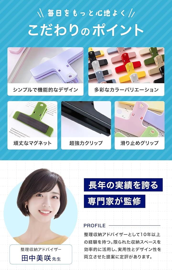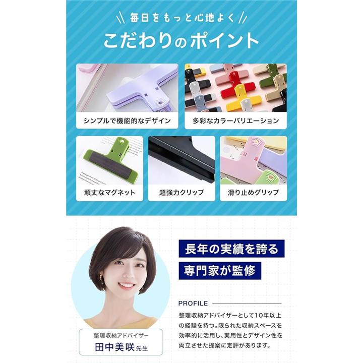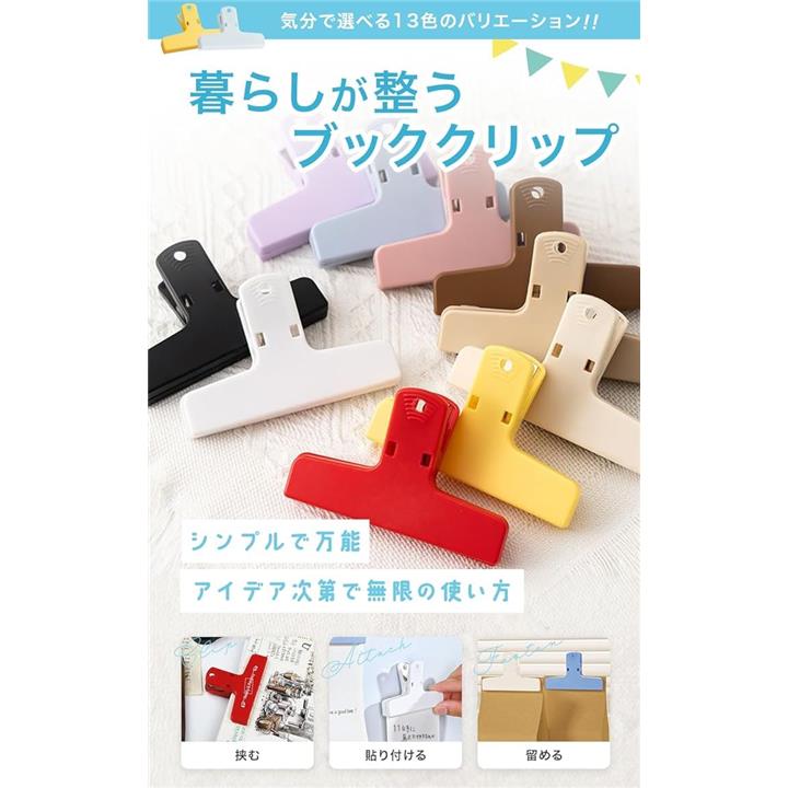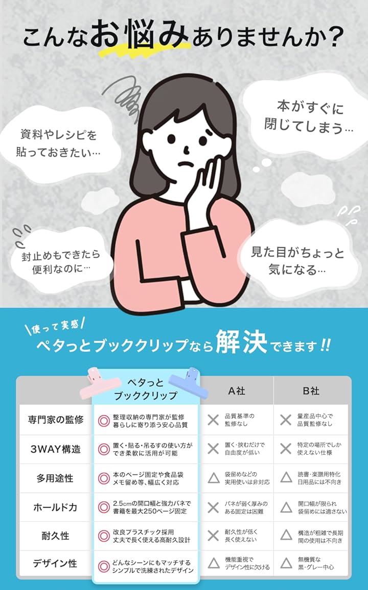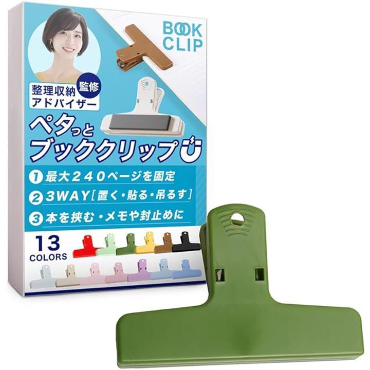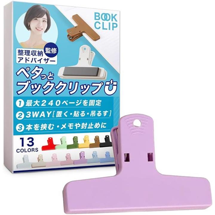 メモや封止めにも使える多用途設計」厚みのある本のページ固定はもちろん、ちょっとしたメモやレシピ、学校からのお知らせ、さらには食品袋などの封も簡単にとめることが可能。