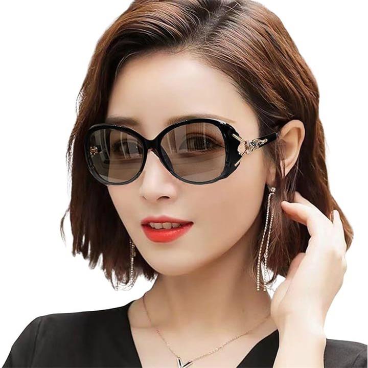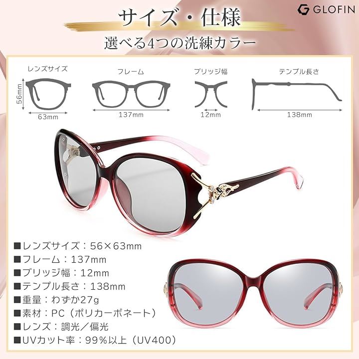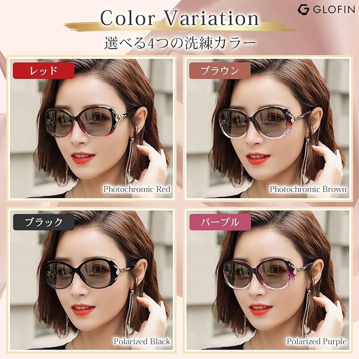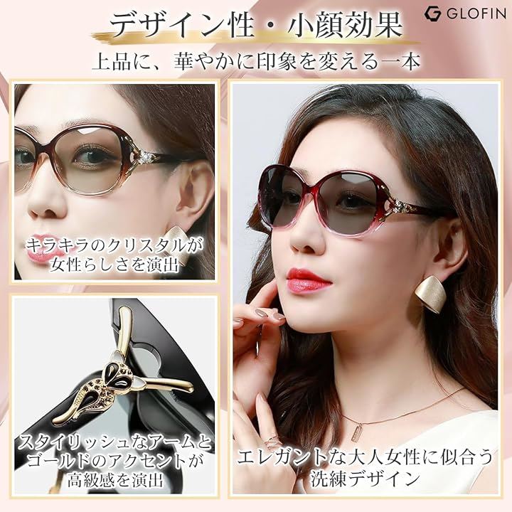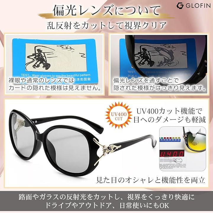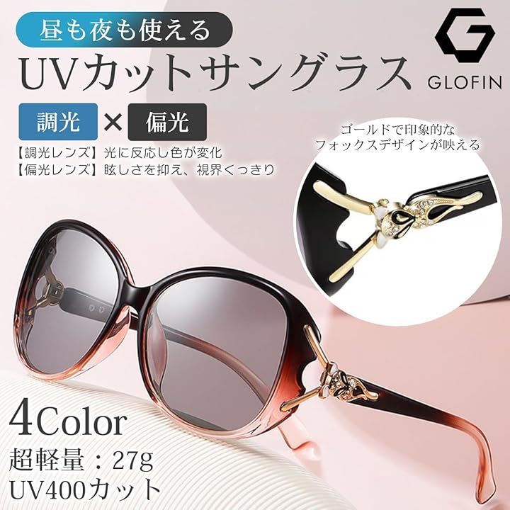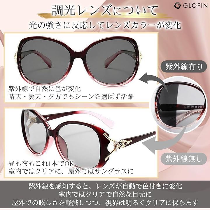 GLOFIN サングラス レディース 偏光サングラス UVカット 調光 大きめ 紫外線カット 旅行 屋外 運転用 ビッグフレーム