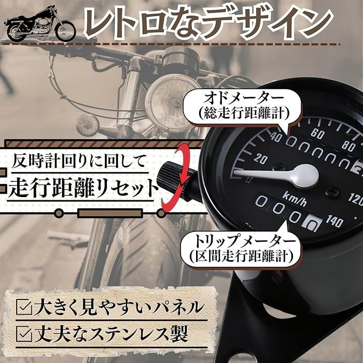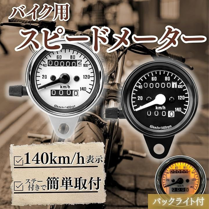 互換品 バイク用 スピードメーター 140km 汎用 12V 取付簡単 ステー付 走行距離 バックライト トリップメーター オドメーター