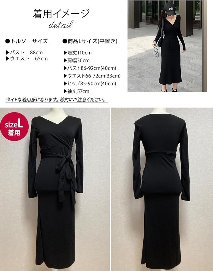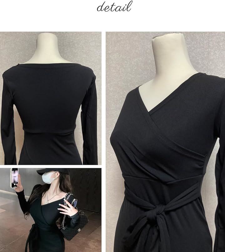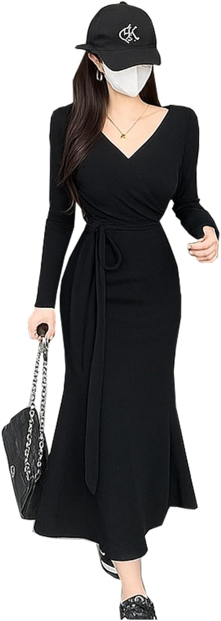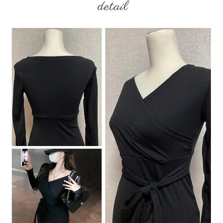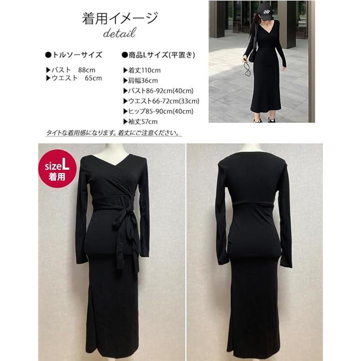 タイト ワンピース レディース 秋冬 長袖 ロング マーメイド フレア カシュクール 胸元 セクシー vネック ウエストリボン ロングワンピ ハイウエスト きれいめ