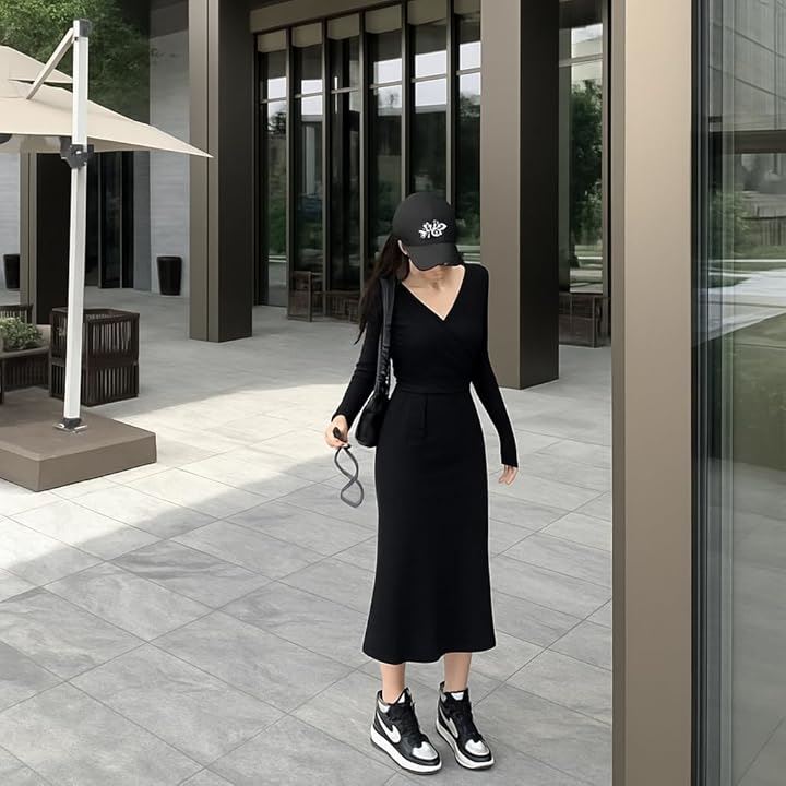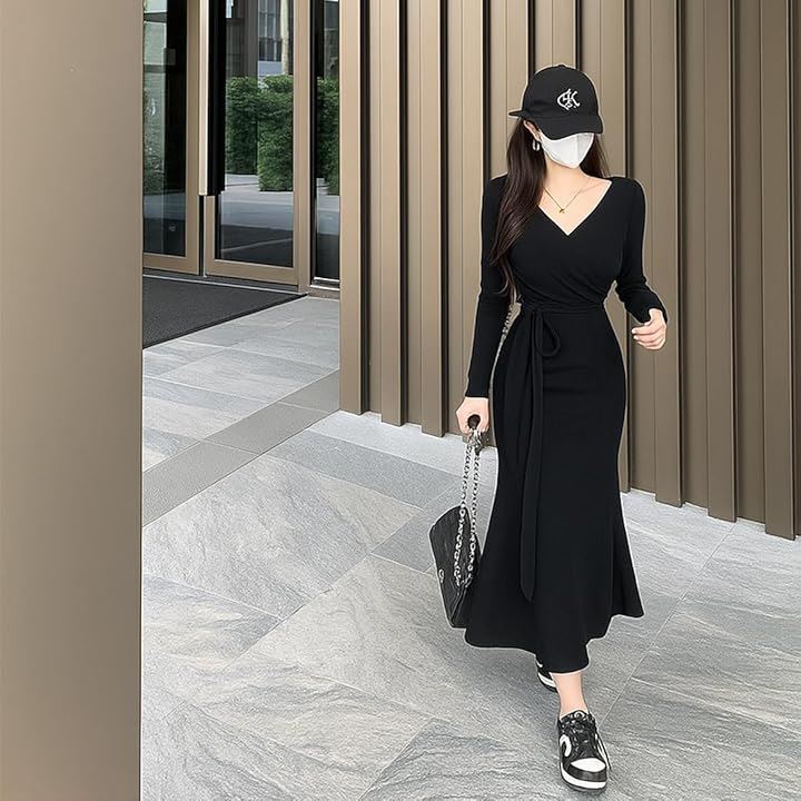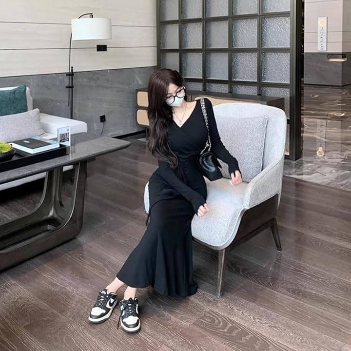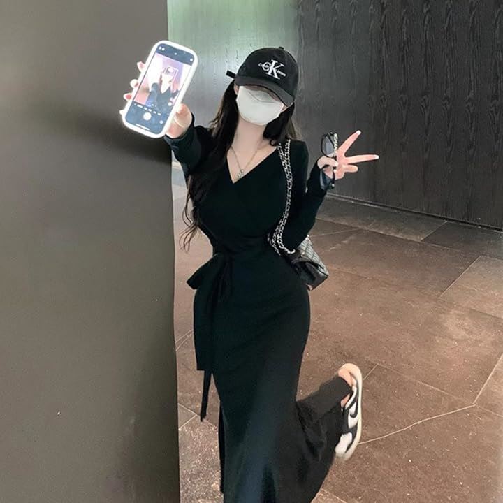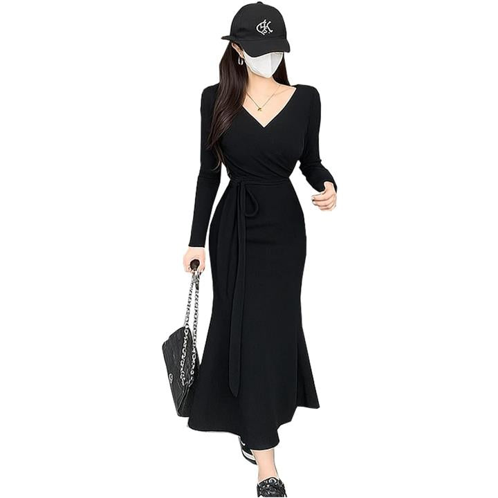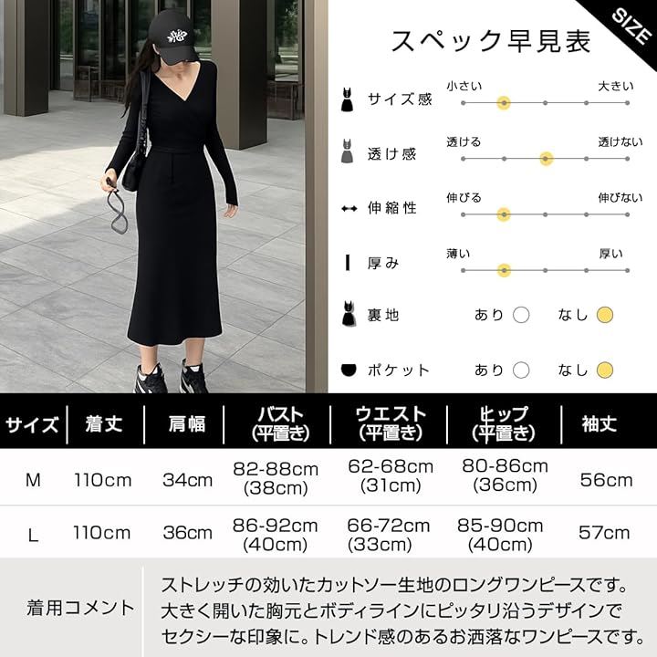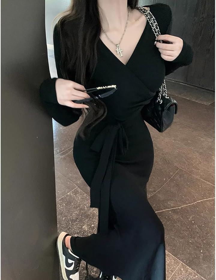 タイト ワンピース レディース 秋冬 長袖 ロング マーメイド フレア カシュクール 胸元 セクシー vネック ウエストリボン ロングワンピ ハイウエスト きれいめ