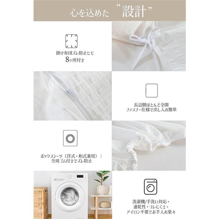 機能性が光るこだわり設計: 掛け布団カバー:側面全開ファスナーで布団交換が瞬時に完了、内側8ヶ所の固定ベルトで寝ている時のずれを防止 ボックスシーツ:全周360°伸縮バンド採用で高さ3-30cmのマットレス/敷布団にピタッと密着。