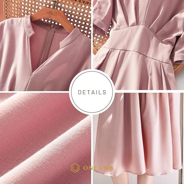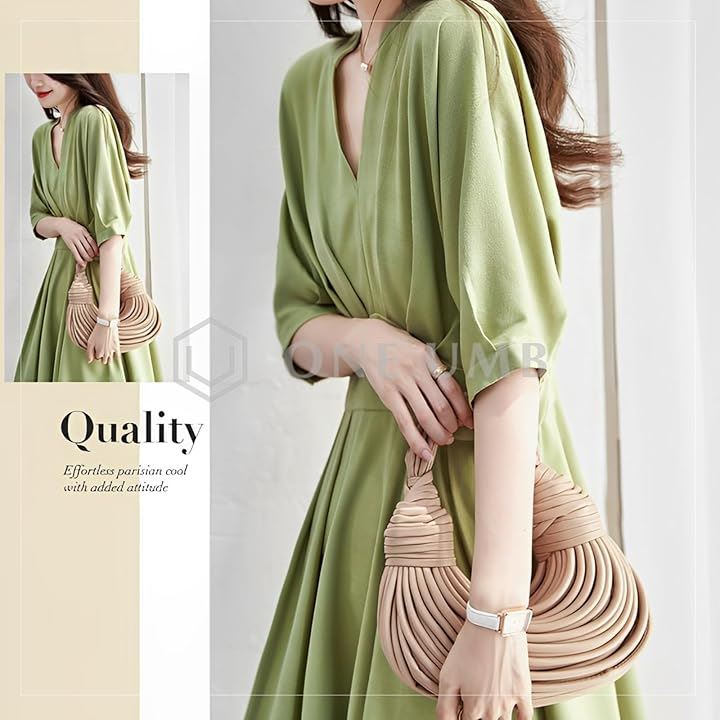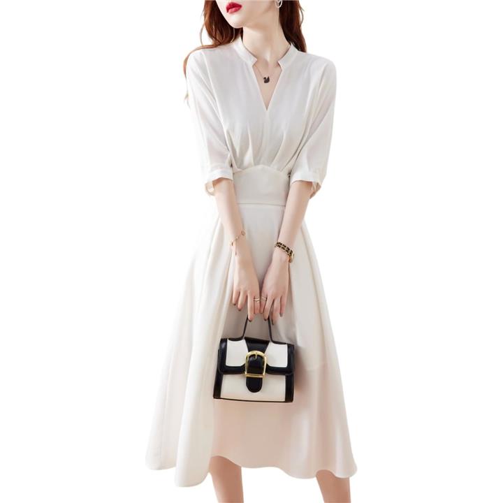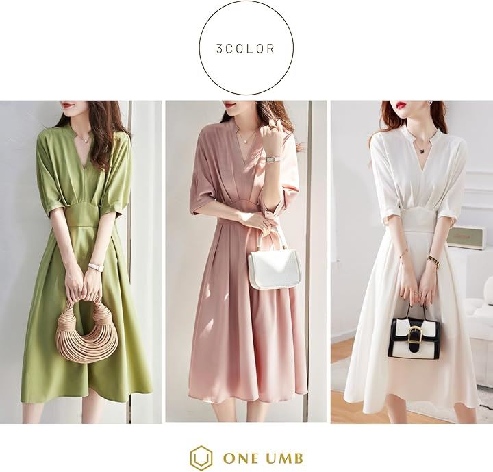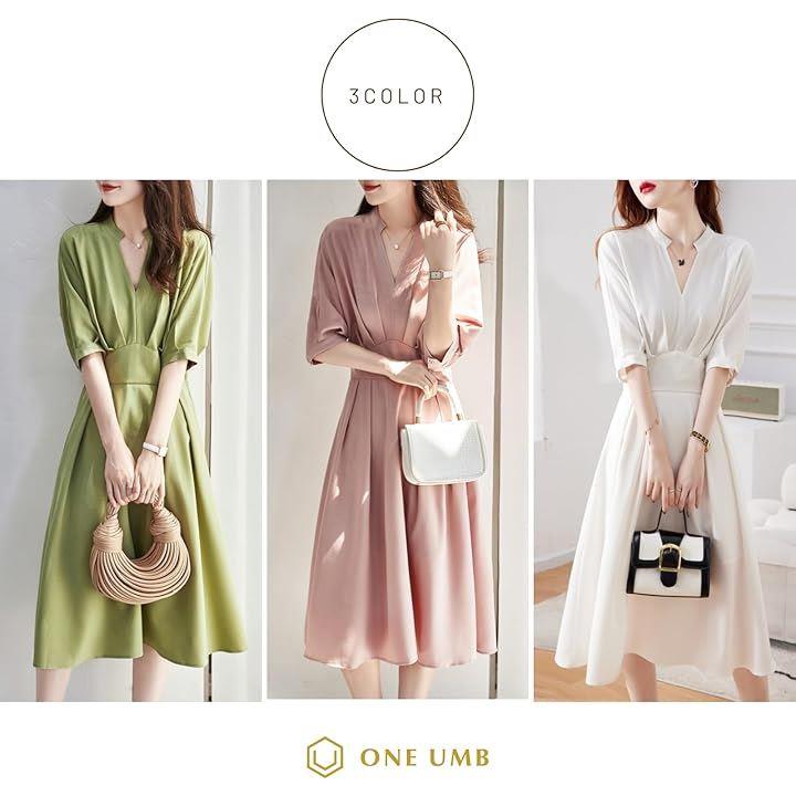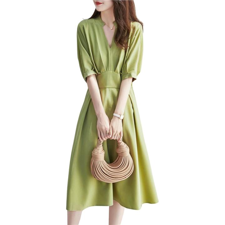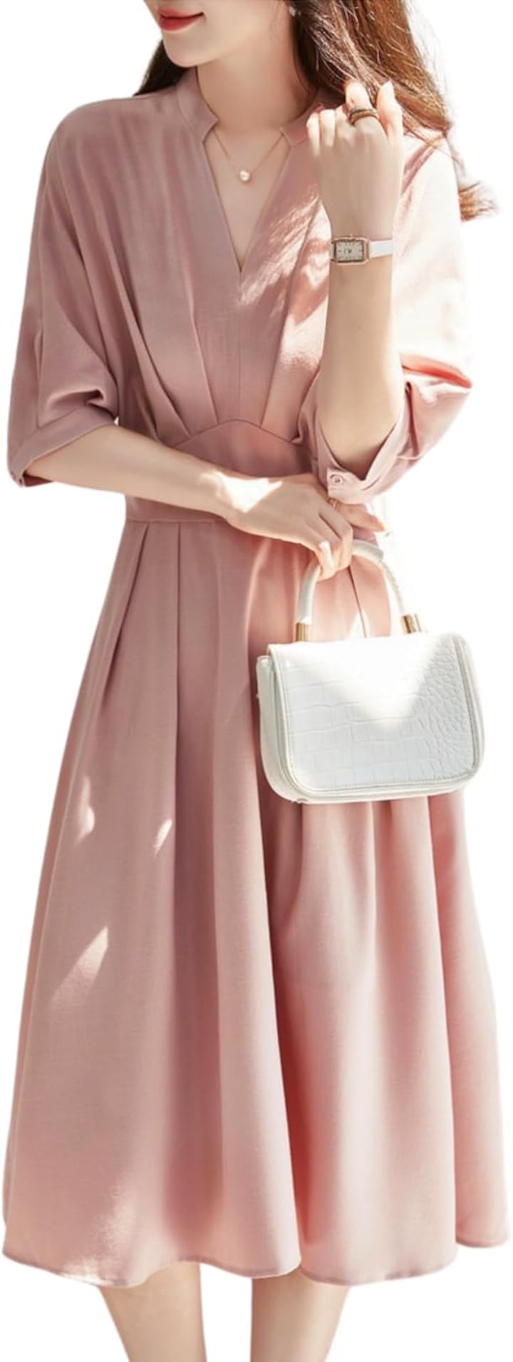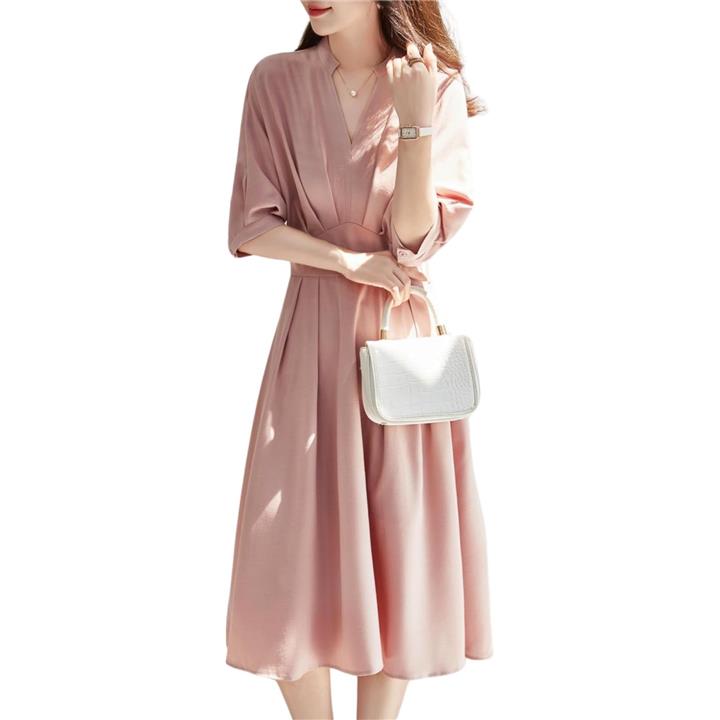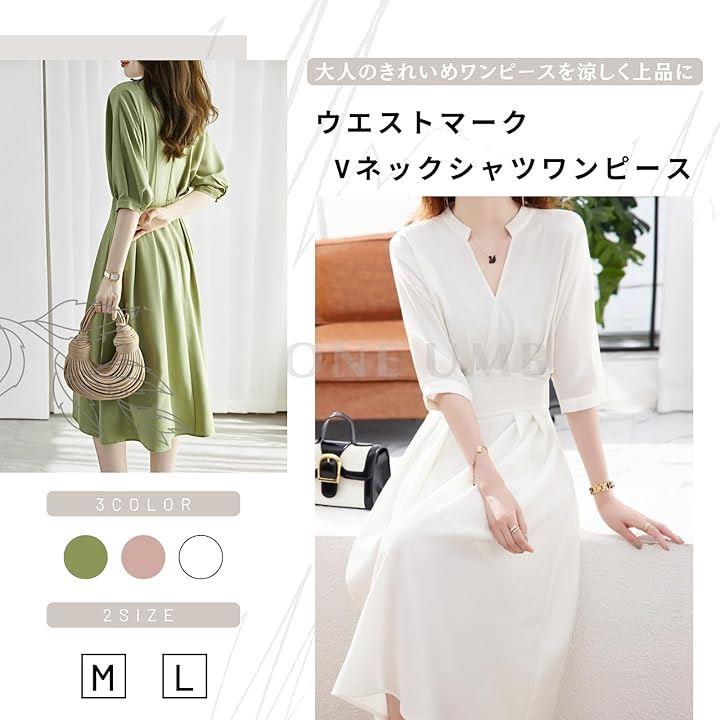 vネック シャツワンピース ロング 五分袖 レディース 半袖ワンピース 着痩せ aラインワンピース バックファスナー ミモレ丈