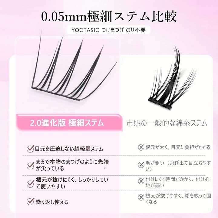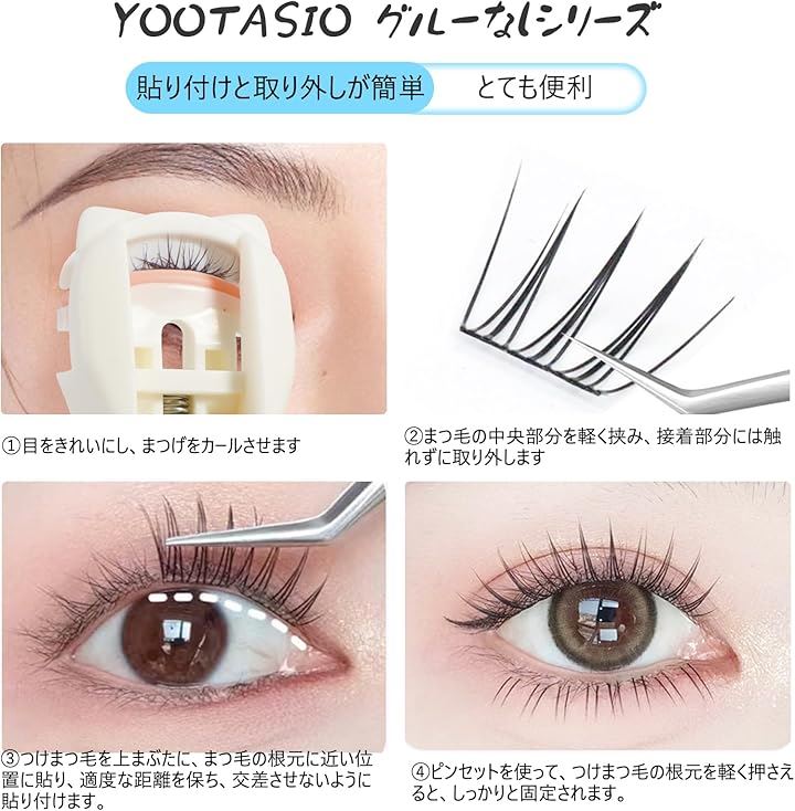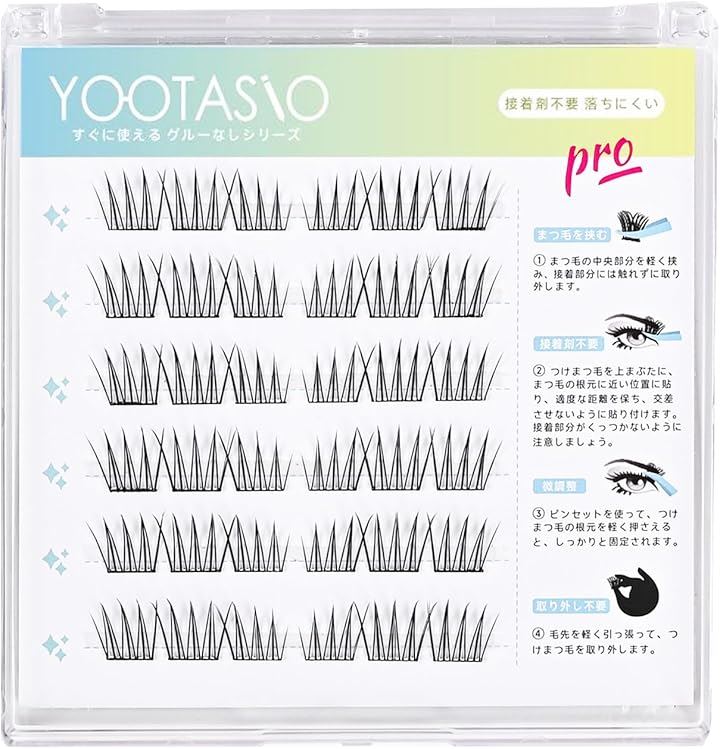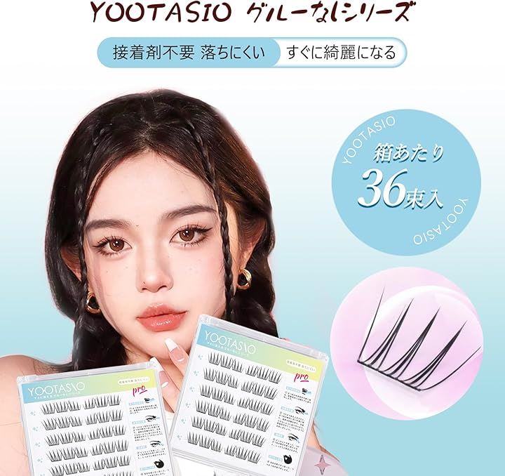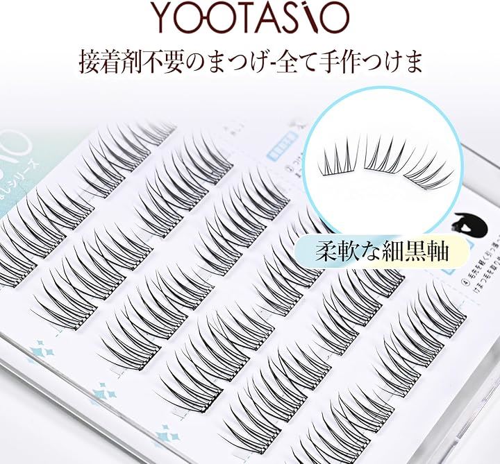 「柔軟な透明軸つけまつげ束感」YOOTASIOこのつけまつげは、アイドルグループのステージメイクからインスパイアされ、繊細な繊維とボリューム感で自然な束感を実現します。