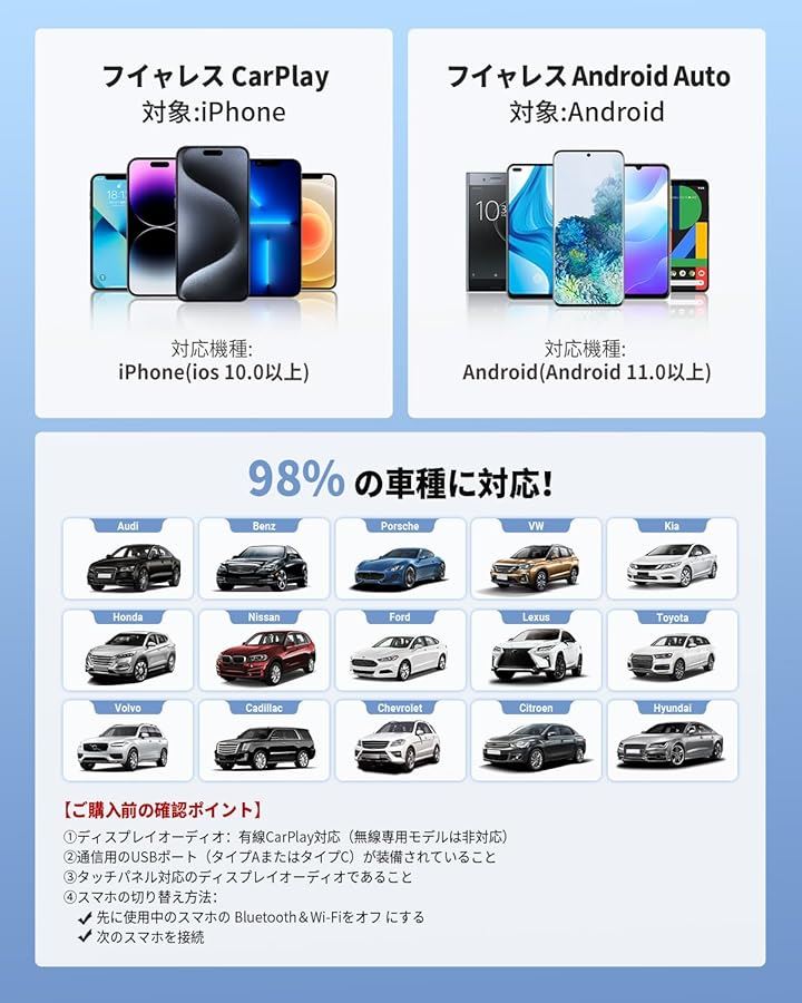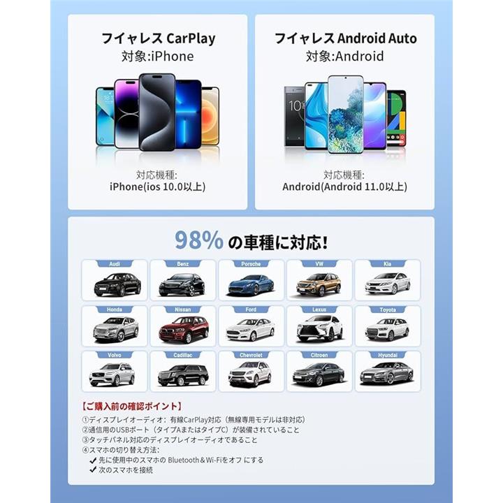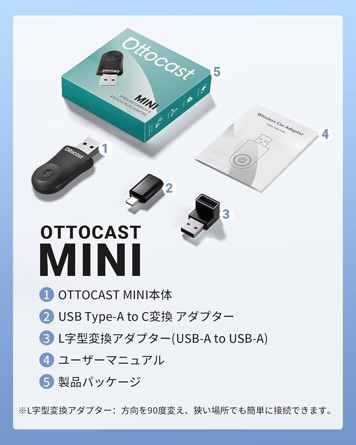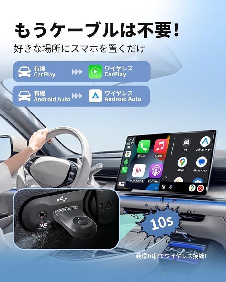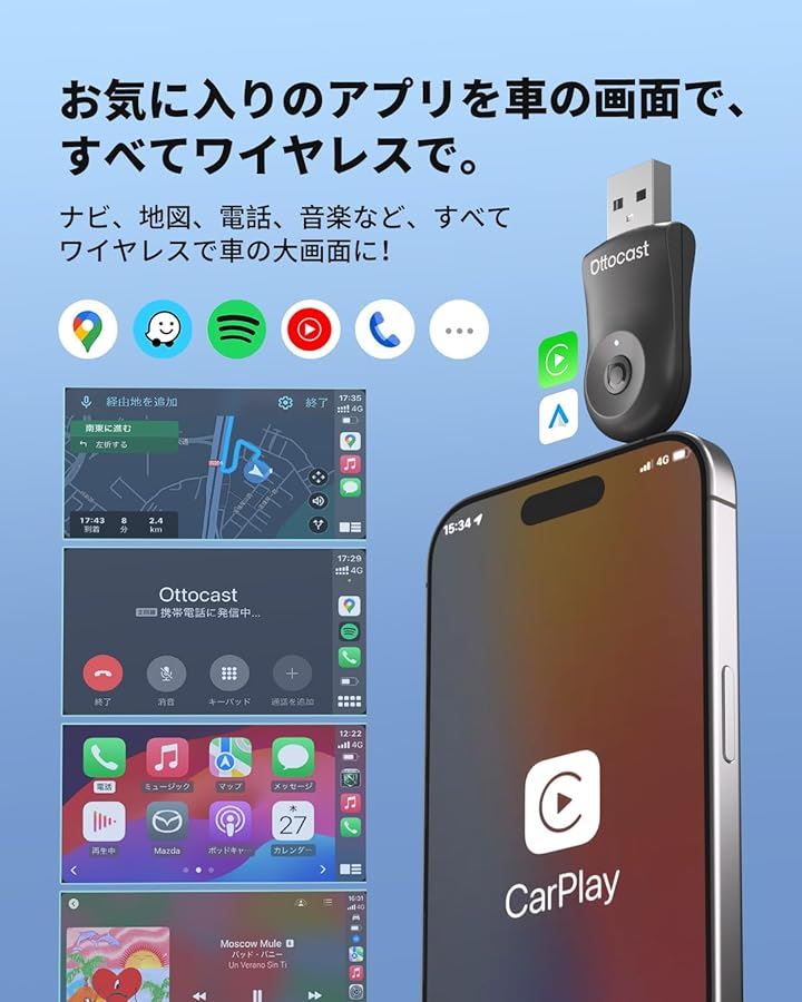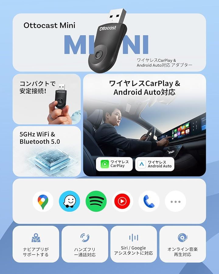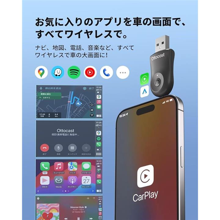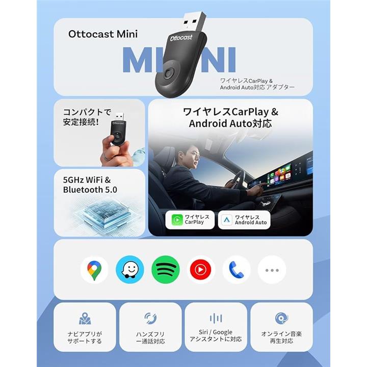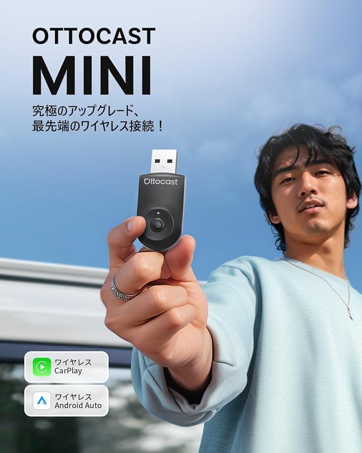 公式 オットキャスト Mini 2025最新 ワイヤレスCarPlay/Android Autoアダプター ミニ 純正有線CarPlay/Android Auto対応車専用 Bluetooth音楽