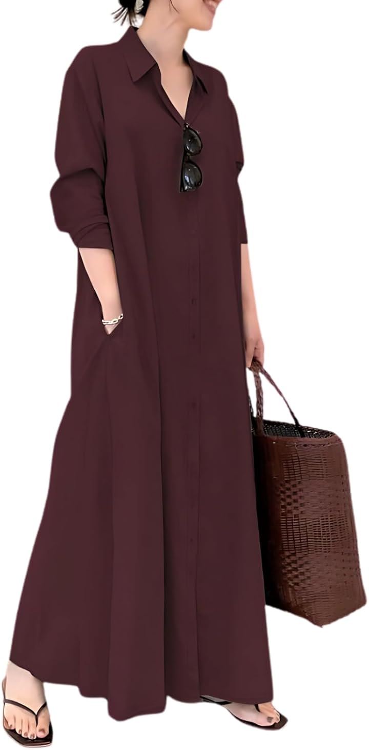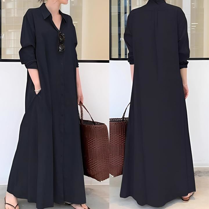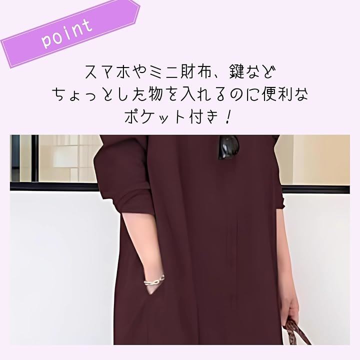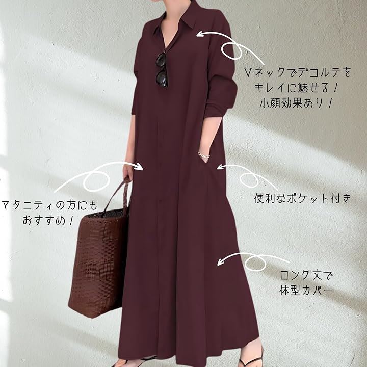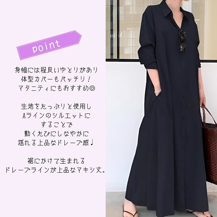 ワンピース シャツ ロング 無地 マキシ丈 カジュアル レディース 黒 体型カバー Vネック ゆったり チュニック きれいめ Aライン 2Way ドレス ボタン付き