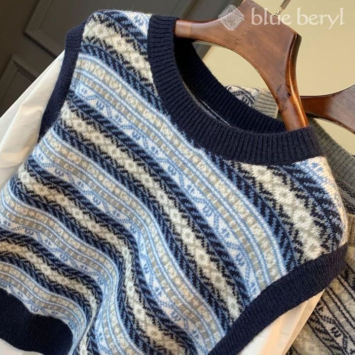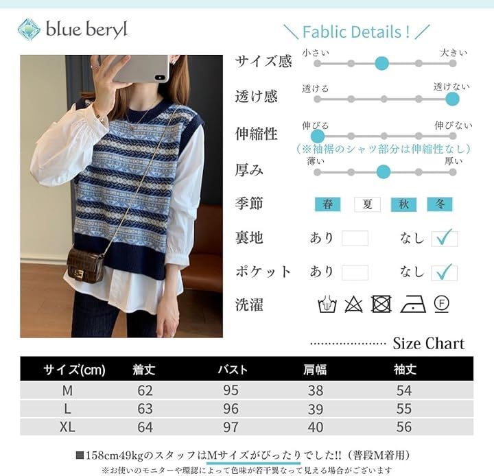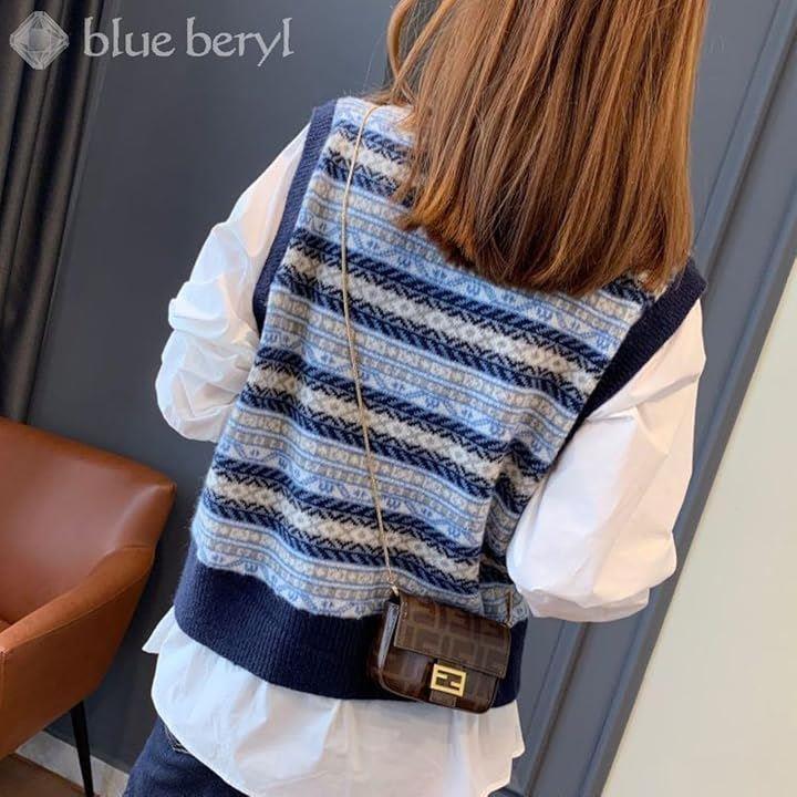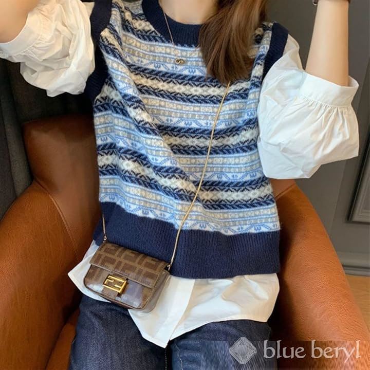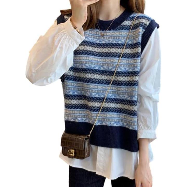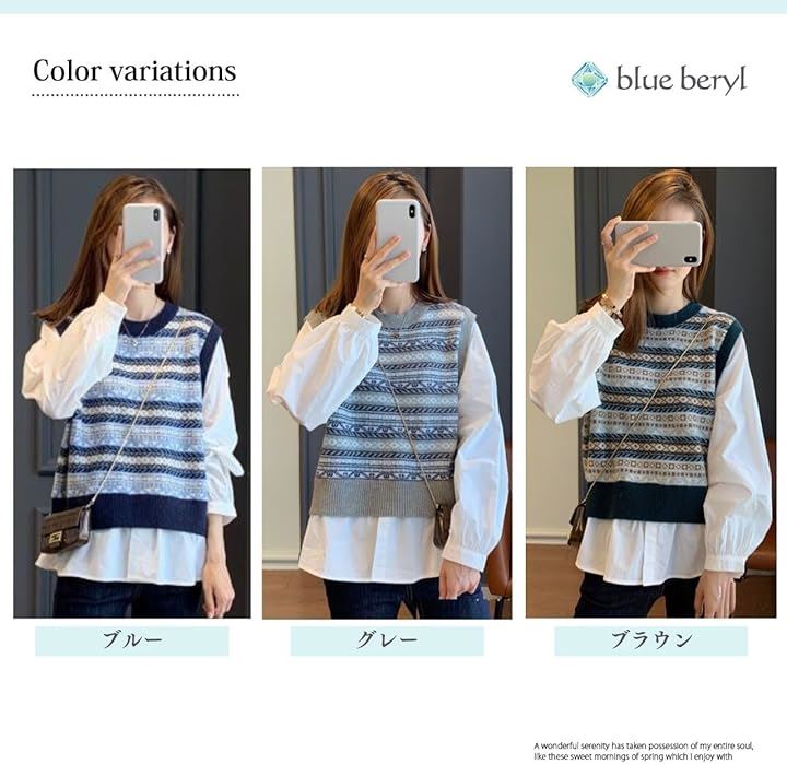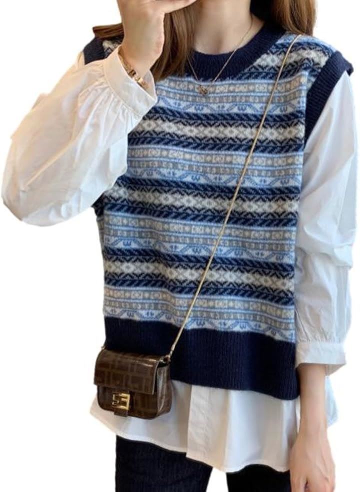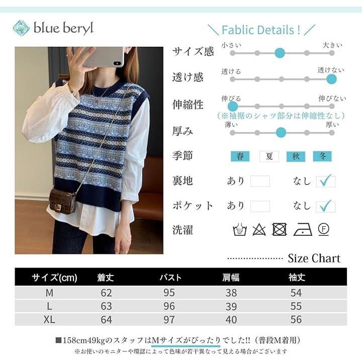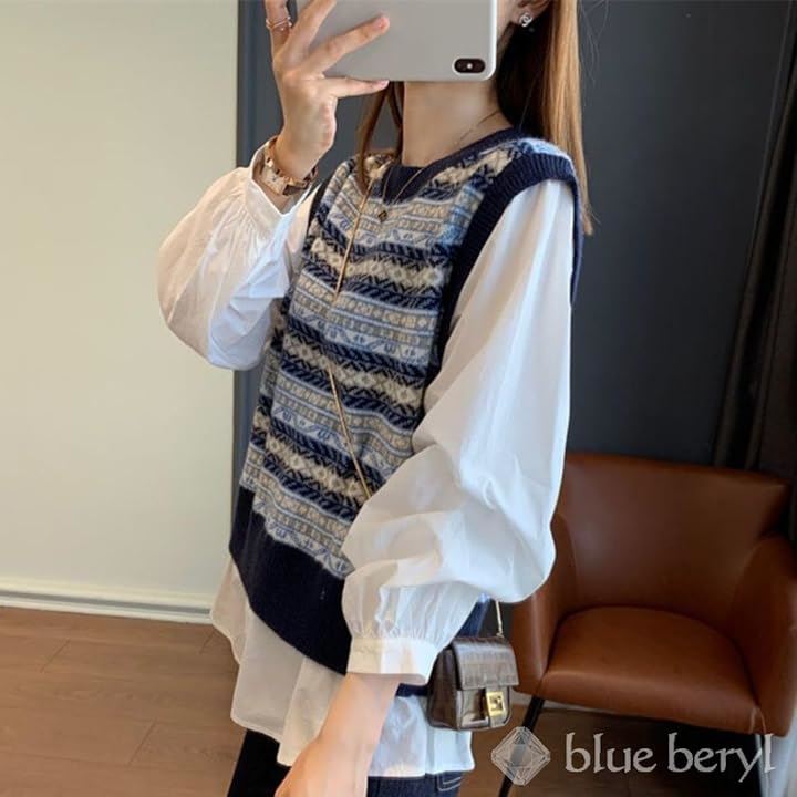 ブルーベリル 重ね着風トップス レディース ニットベスト フェアアイル柄 バルーンスリーブブラウス プルオーバー 襟なし