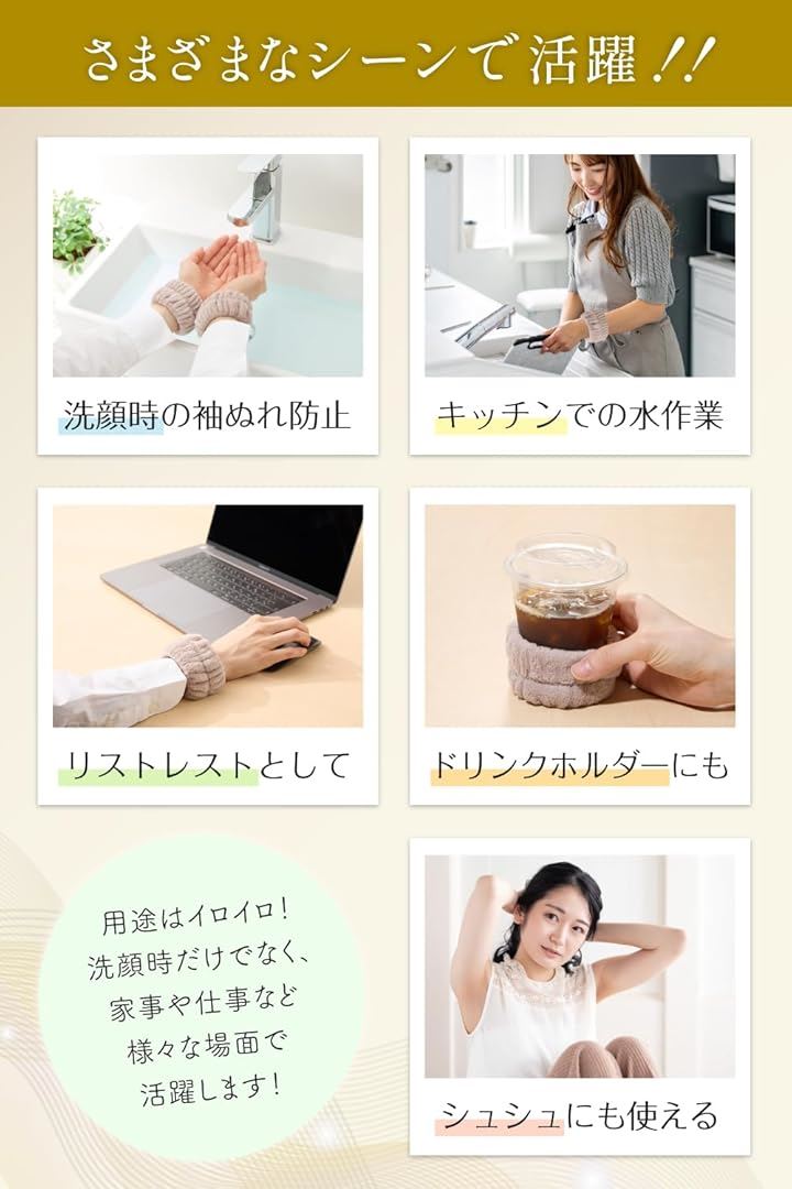 「さまざまなシーンで活躍..」用途はイロイロ。洗顔時だけでなく、家事や仕事など様々な場面で活躍します。洗顔時の袖ぬれ防止、キッチン作業、浴室掃除などの水仕事、リストレストやドリンクホルダーとしても使用可能。