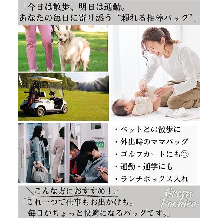 ◉日常の普段使いとして、犬のお散歩バッグ・ママバッグ(哺乳瓶やおむつセット)・仕事用バッグ・デイサービス用バッグ・オフィスバッグ・サブバッグ・ゴルフの際のカートバッグなど幅広い目的でお使い頂けます。