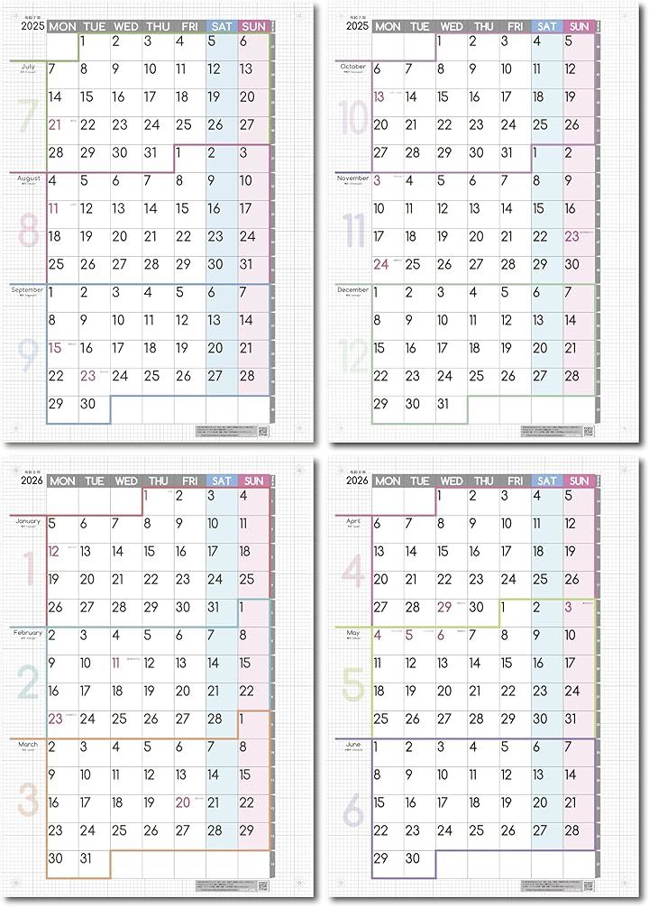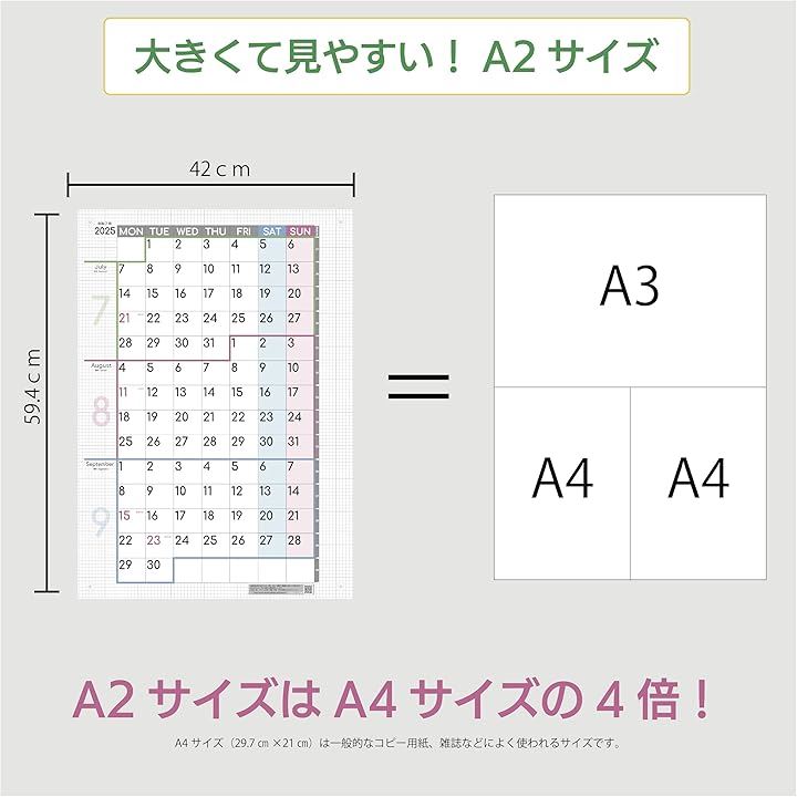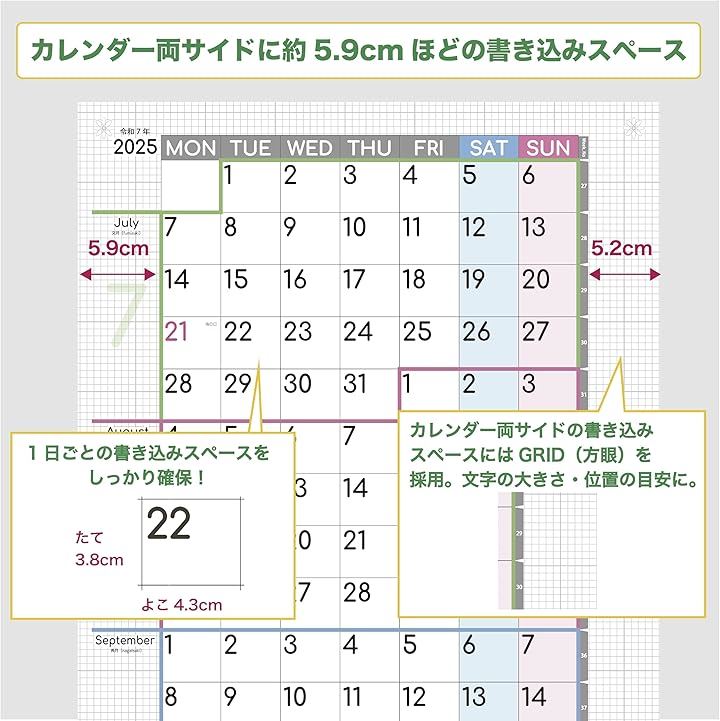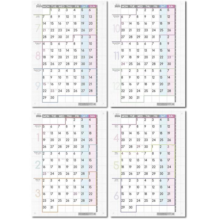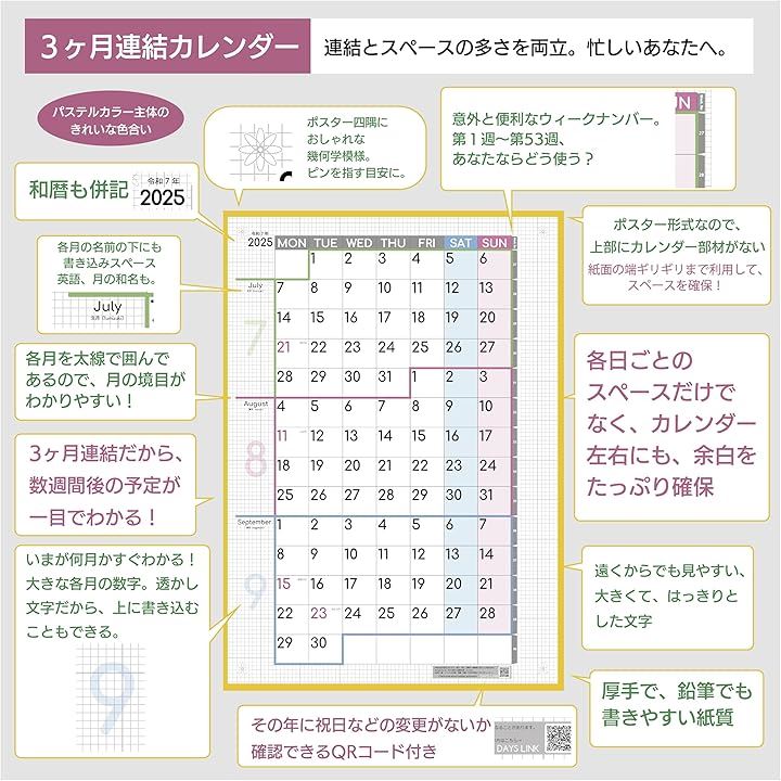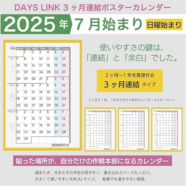 3ヶ月連結カレンダー ポスター 2025年 7月始まり 月曜始まり 大きい 壁掛け