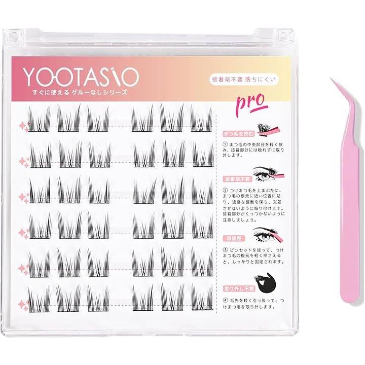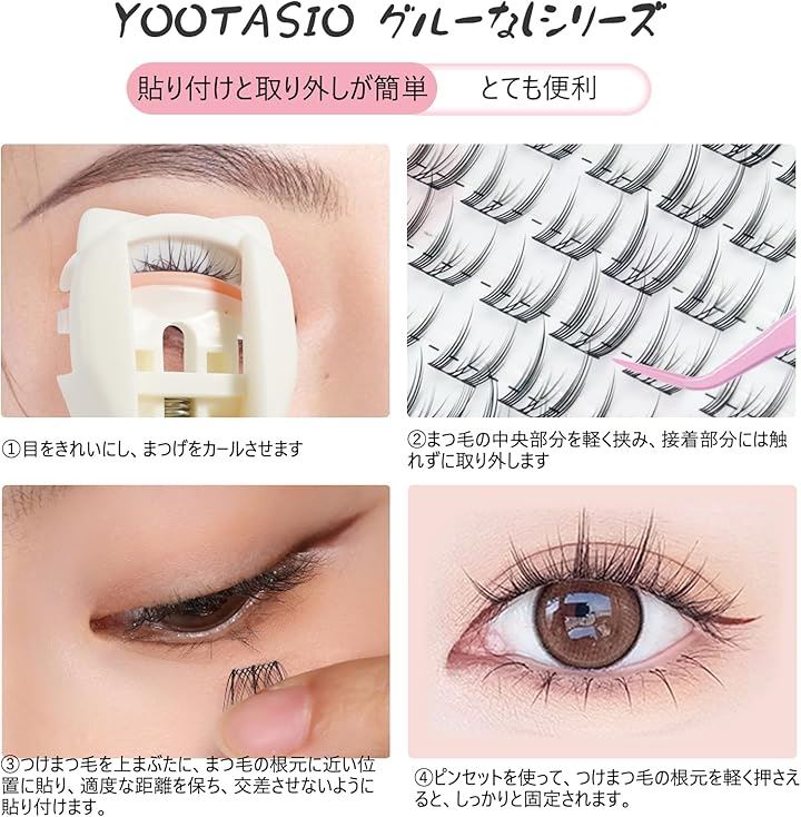 YOOTASIO すぐに使える グルーなしシリーズ 接着剤不要 落ちにくい --- 使用方法: (1) まつ毛の中央部分を軽く挟み、接着部分には触れずに取り外します。