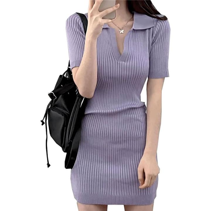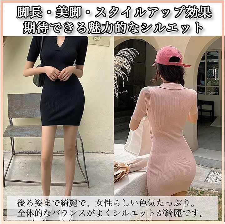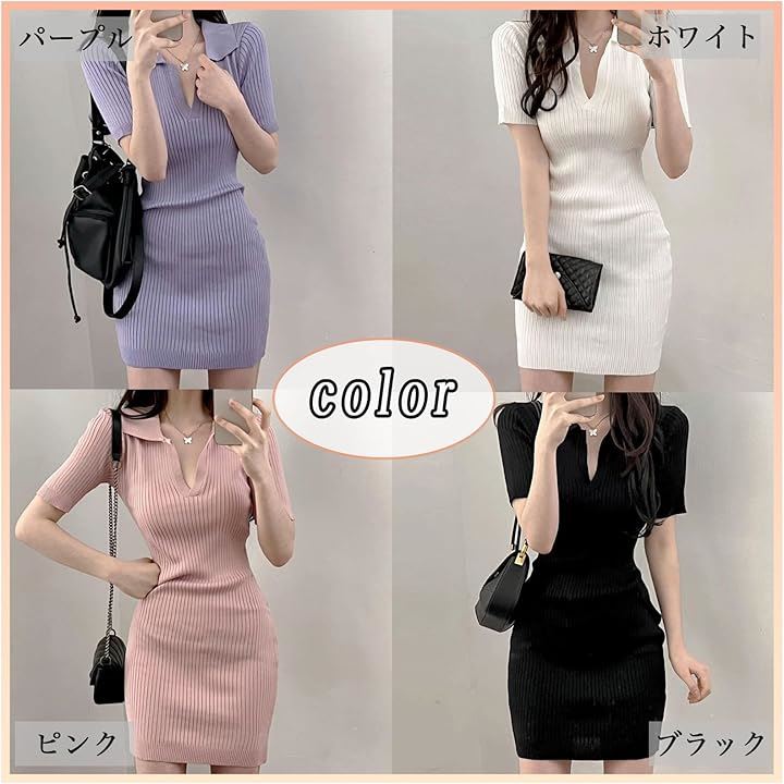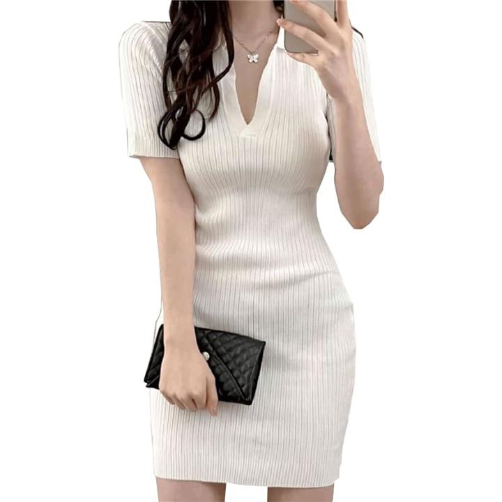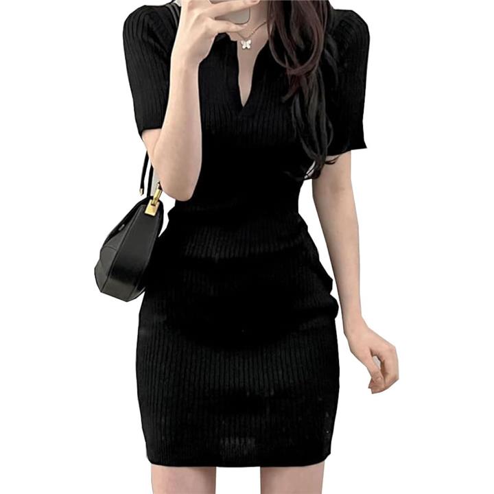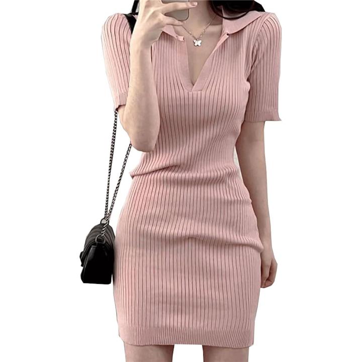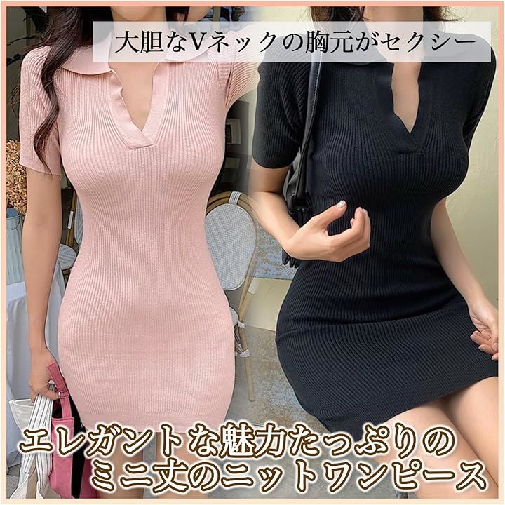 ニット ミニ ワンピース vネック リブニット 襟付き 半袖 タイト ボディコン カジュアル シンプル レディース