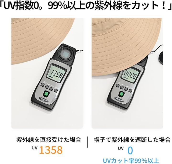 「UVカット率99%以上」帽子内側の測定でUV指数0を実証。
