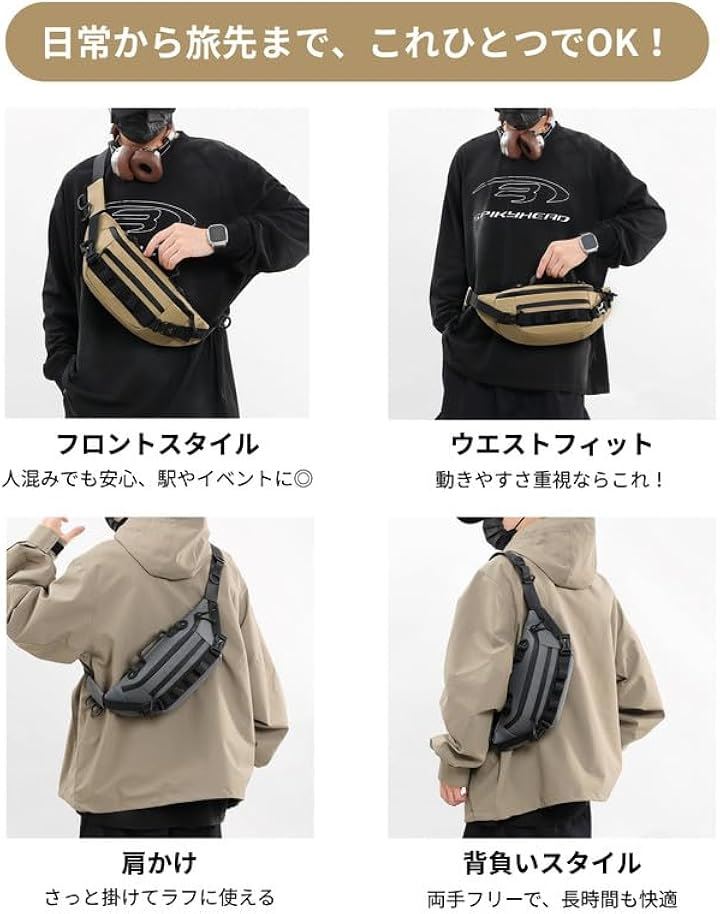 「3WAY仕様で自由な使い方」ウエストポーチ・ボディバッグ・肩掛けバッグとして使用可能。