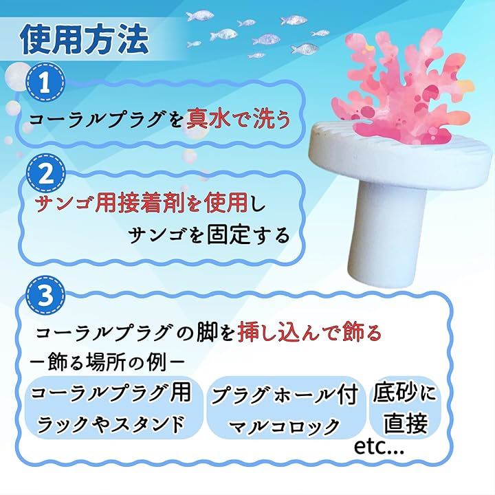 「使い方ステップガイド」 ・接着剤の塗布: 別売りのサンゴ用接着剤をプラグの台座面に均一に薄く塗布します。