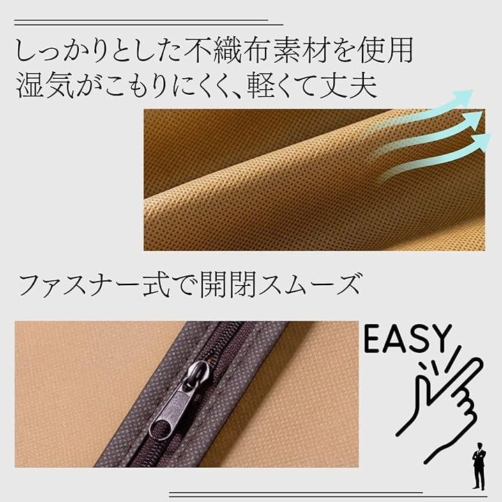 「通気性の良い不織布で衣類をしっかり保護」通気性に優れた不織布素材を使用しているため、湿気がこもりにくく、衣類をカビや臭いから守ります。