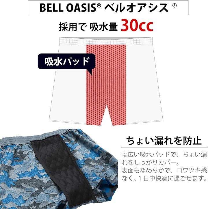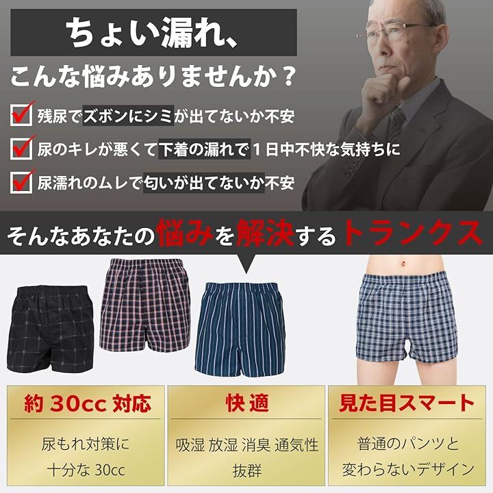 「メンズちょい漏れ対策トランクス」 このトランクスは、ちょい漏れ対策として設計されており、吸水性が高く、約30ccの液体を吸収します。