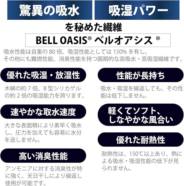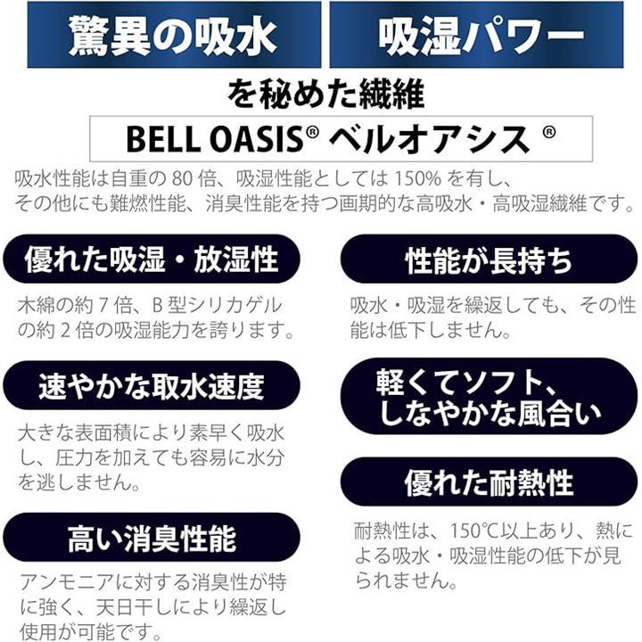 「機能性:高吸水・高吸湿繊維BELLOASIS」 防水布には日本製の高吸水・高吸湿繊維BELLOASISを採用しており、約30ccの液体を吸収。