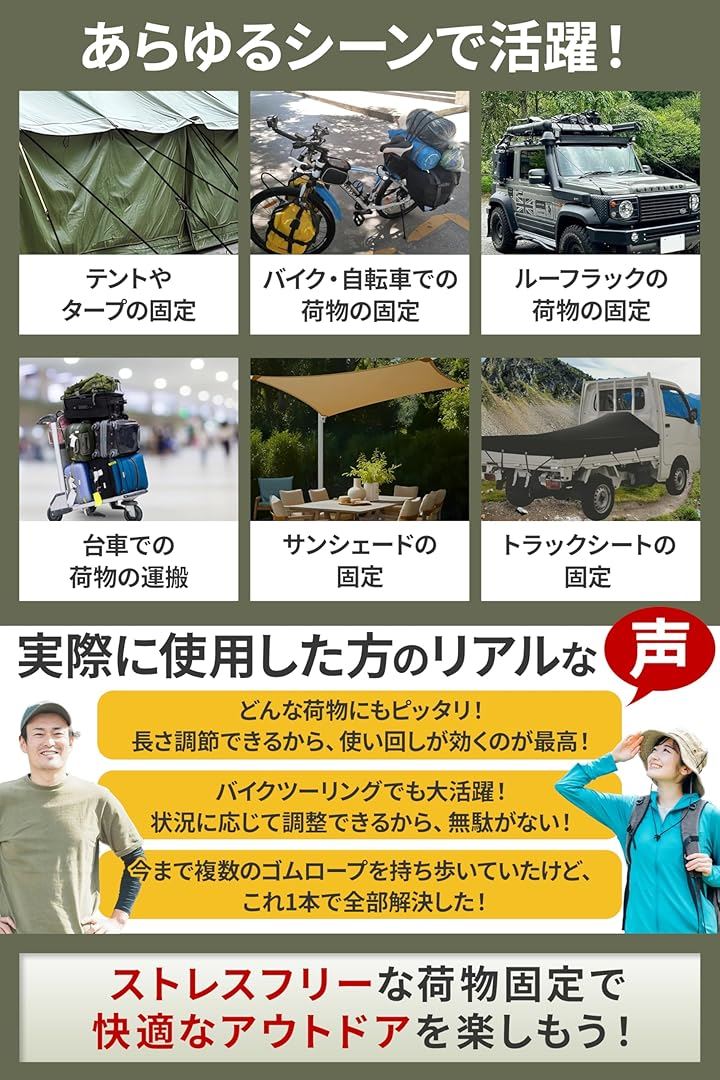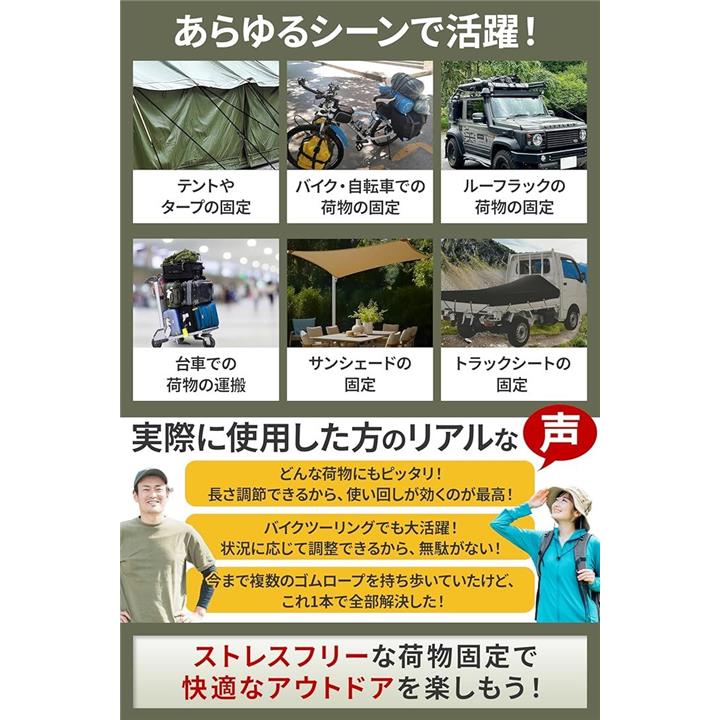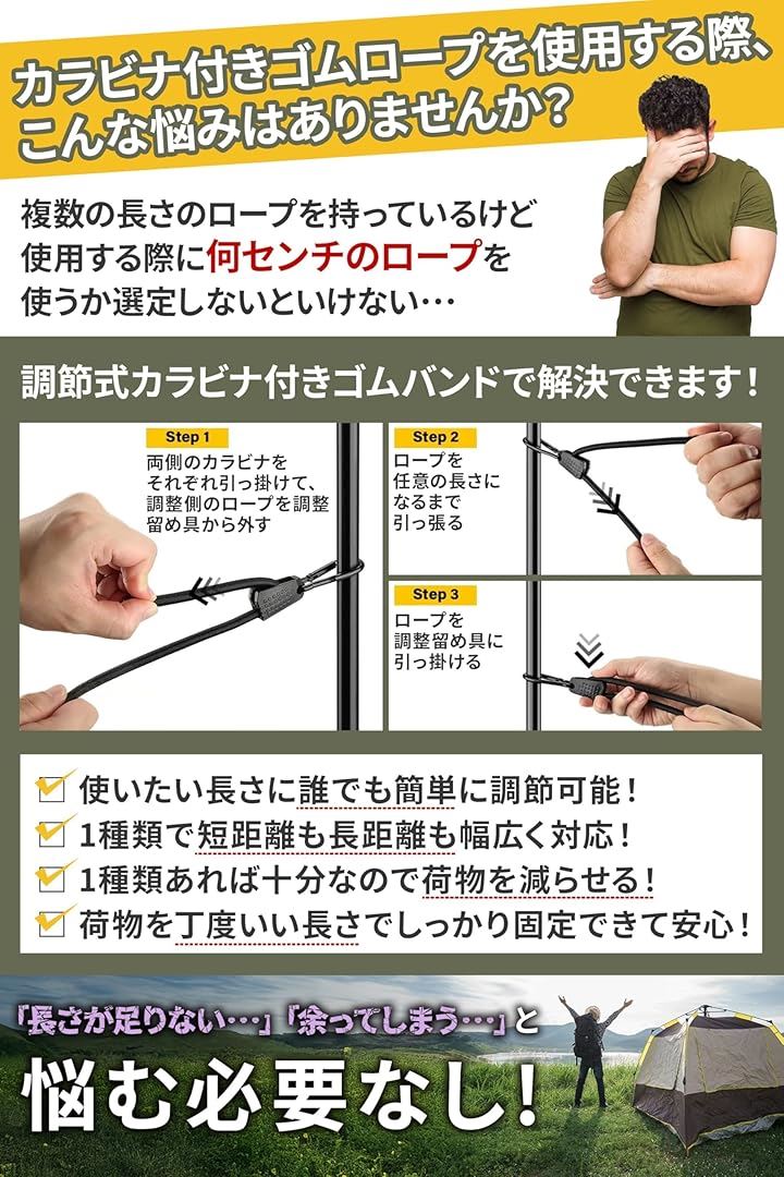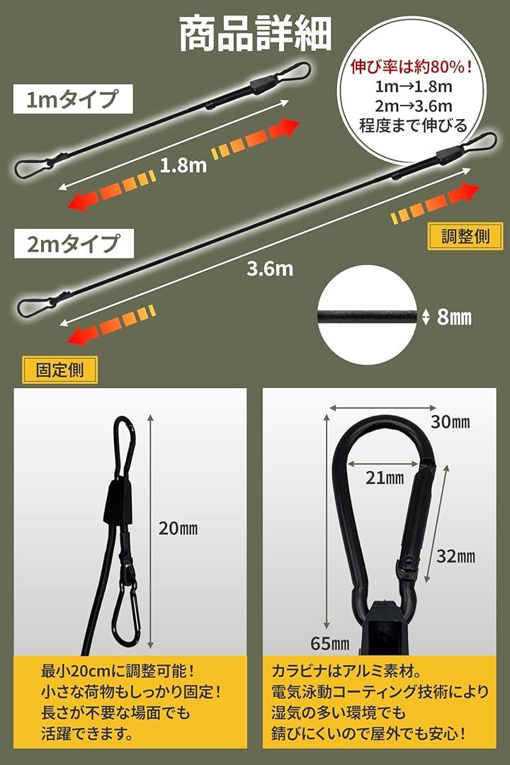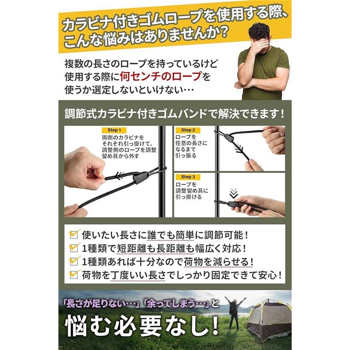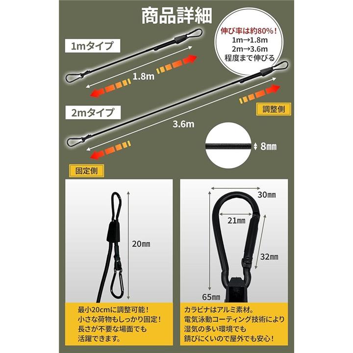 調節式 カラビナフック ゴムバンド 長さ自由自在 太さ8mm バンジーコード バンジーストラップ 荷締め ゴムロープ 荷台用 荷物固定 荷崩れ防止 自転車 バイク アウトドア キャンプ