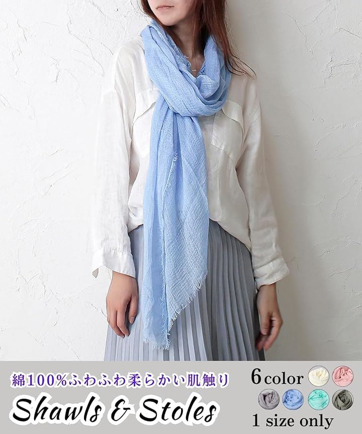 「綿100%ふわふわ柔らかい肌触り」「肌にソフトタッチなショールが欲しい」そんな方におすすめの綿100% のレディース 大判 ストールです。