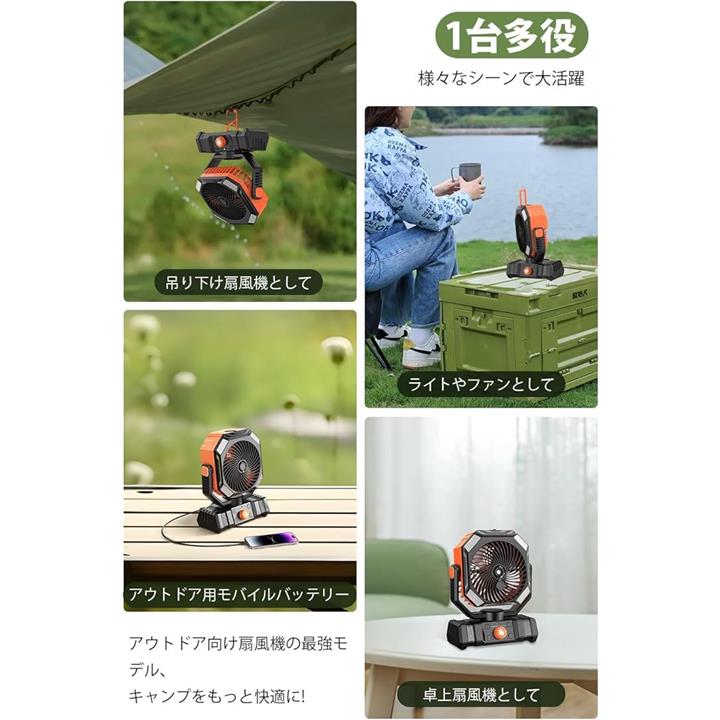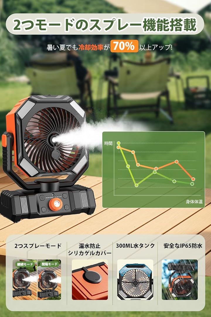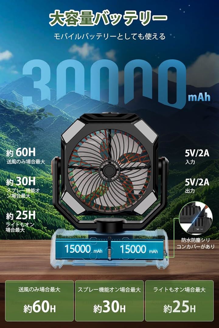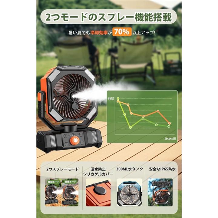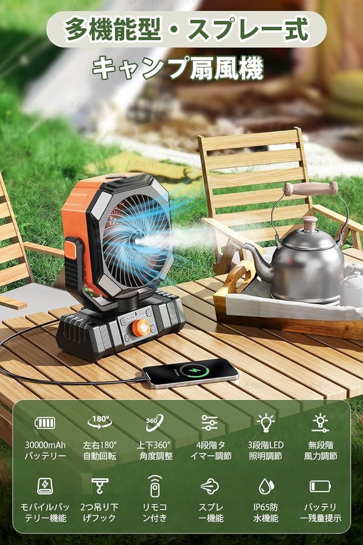 キャンプ 扇風機 卓上扇風機 スプレー機能搭載 dcモーター コードレス リモコン付きせんぷうき 30000mAh アウトドア扇風機 1台多役卓上・吊り下げ・壁掛け・噴霧式・モバイルバッテリーLEDライト 省エネ 軽量 静音 熱中症対策