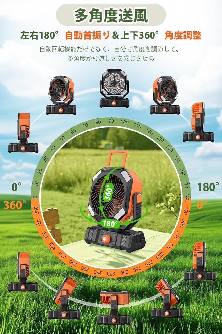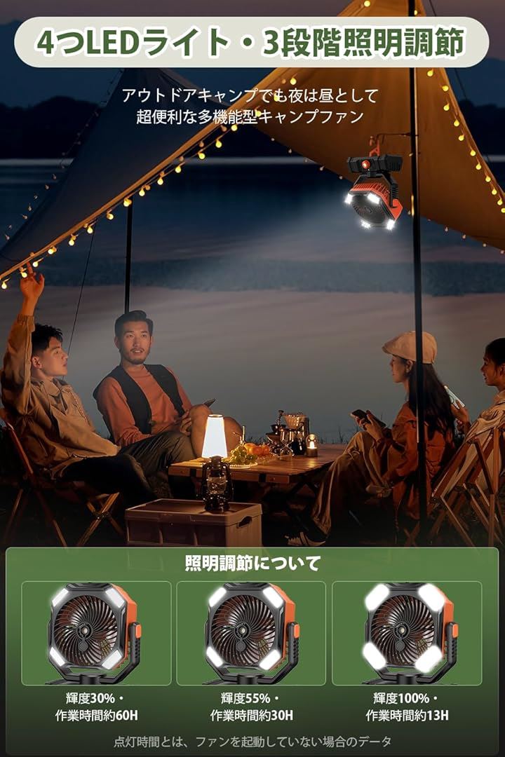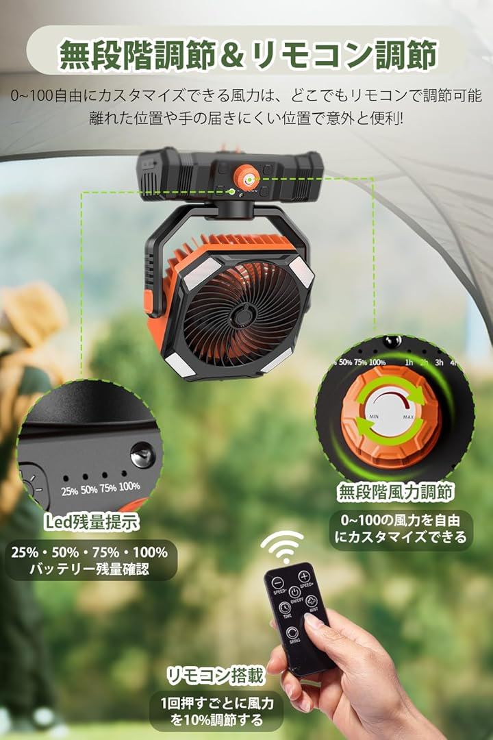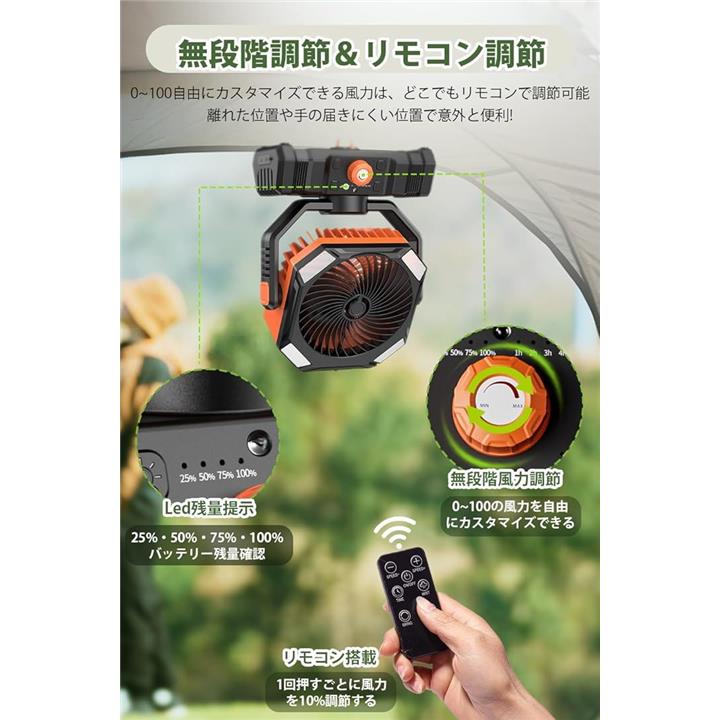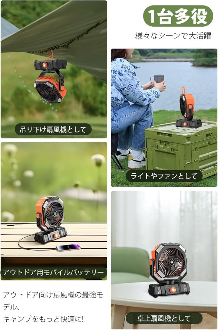 キャンプ 扇風機 卓上扇風機 スプレー機能搭載 dcモーター コードレス リモコン付きせんぷうき 30000mAh アウトドア扇風機 1台多役卓上・吊り下げ・壁掛け・噴霧式・モバイルバッテリーLEDライト 省エネ 軽量 静音 熱中症対策