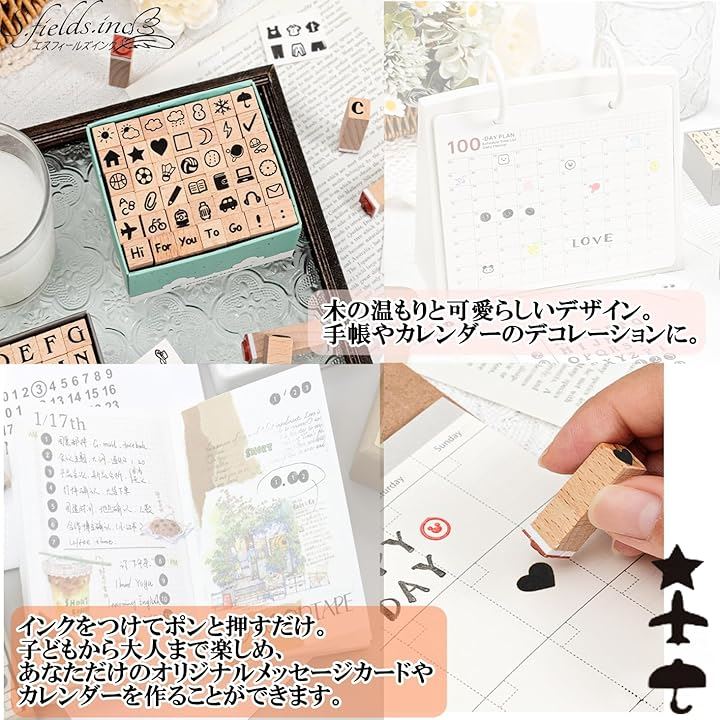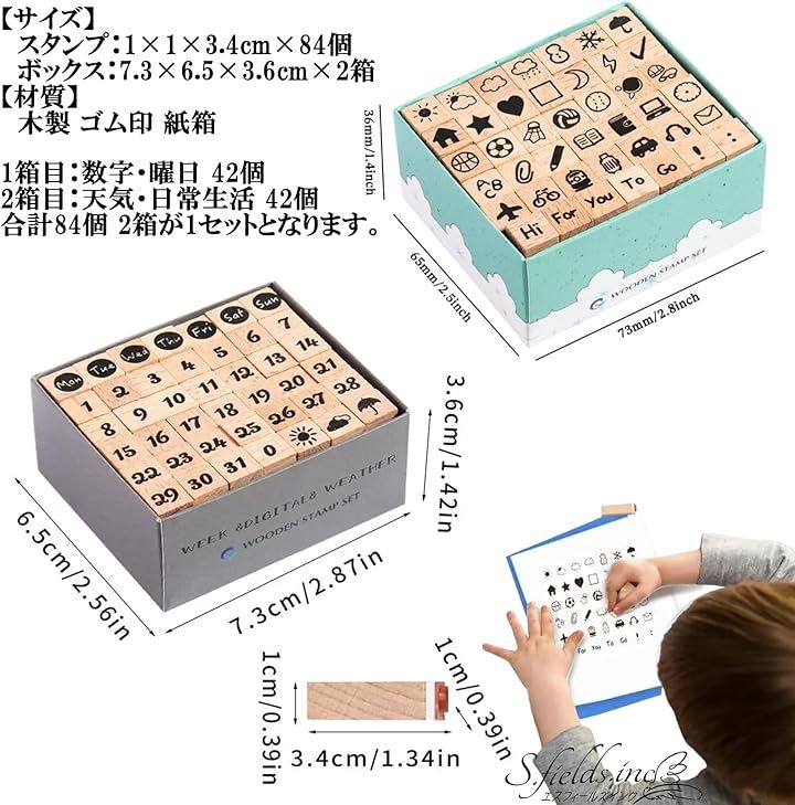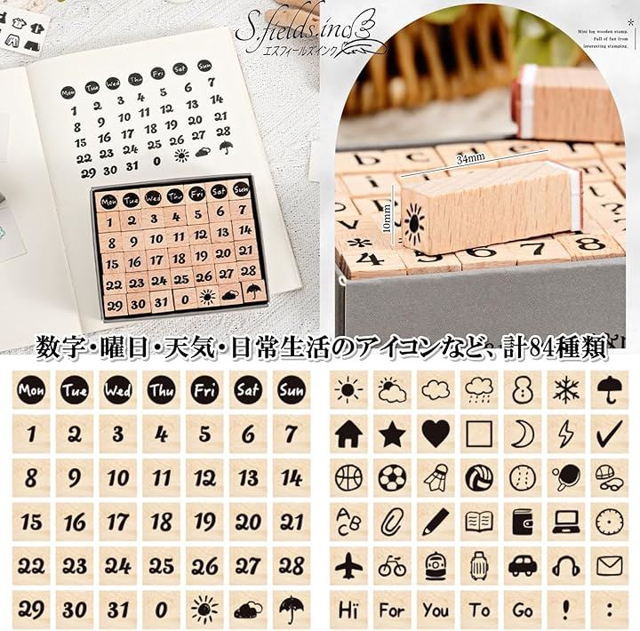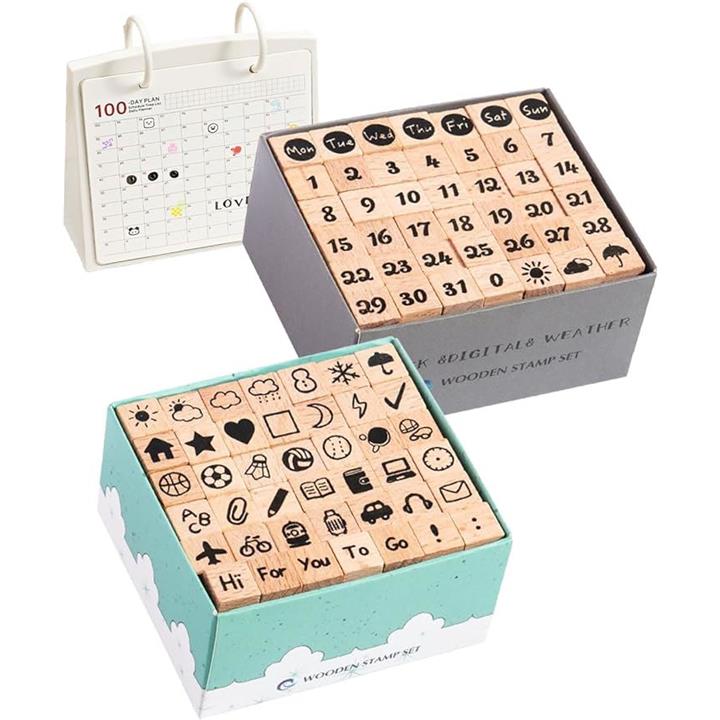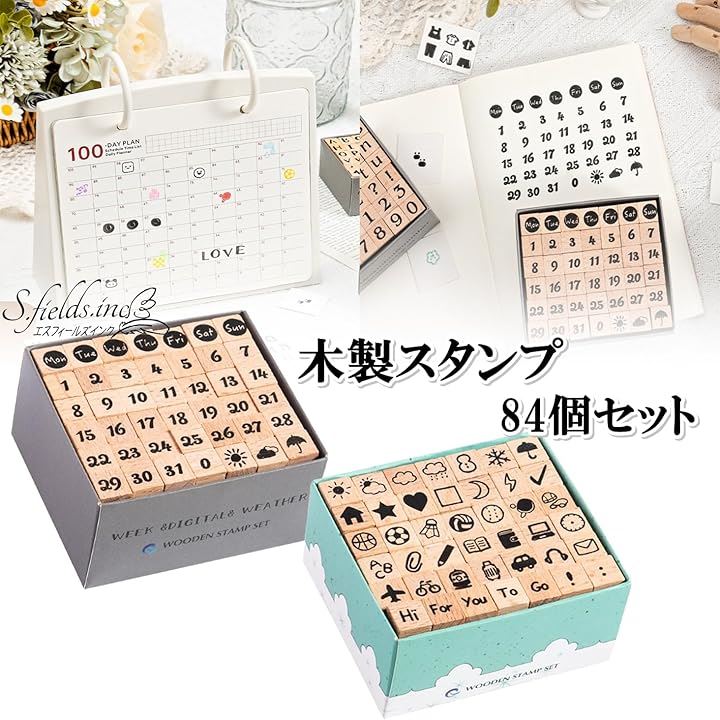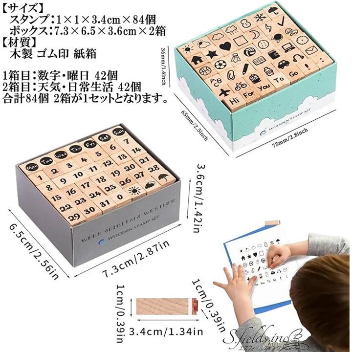 木製スタンプ はんこ 84個セット ゴム印 カレンダー 数字 曜日 日付 天気 日記帳