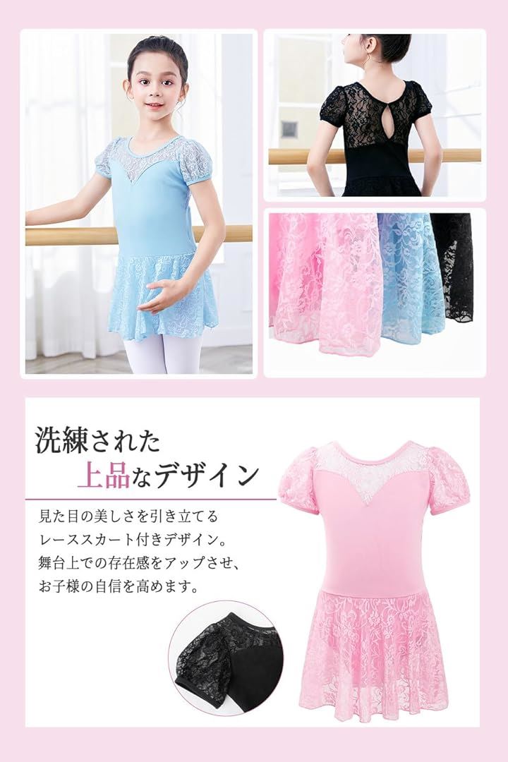 「 デザインの魅力 」このレオタードは、ふんわりとしたスカートと透け感のあるレースが特徴で、可愛らしさと上品さを兼ね備えています。