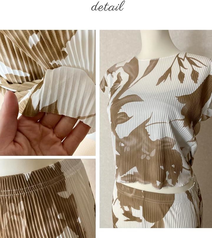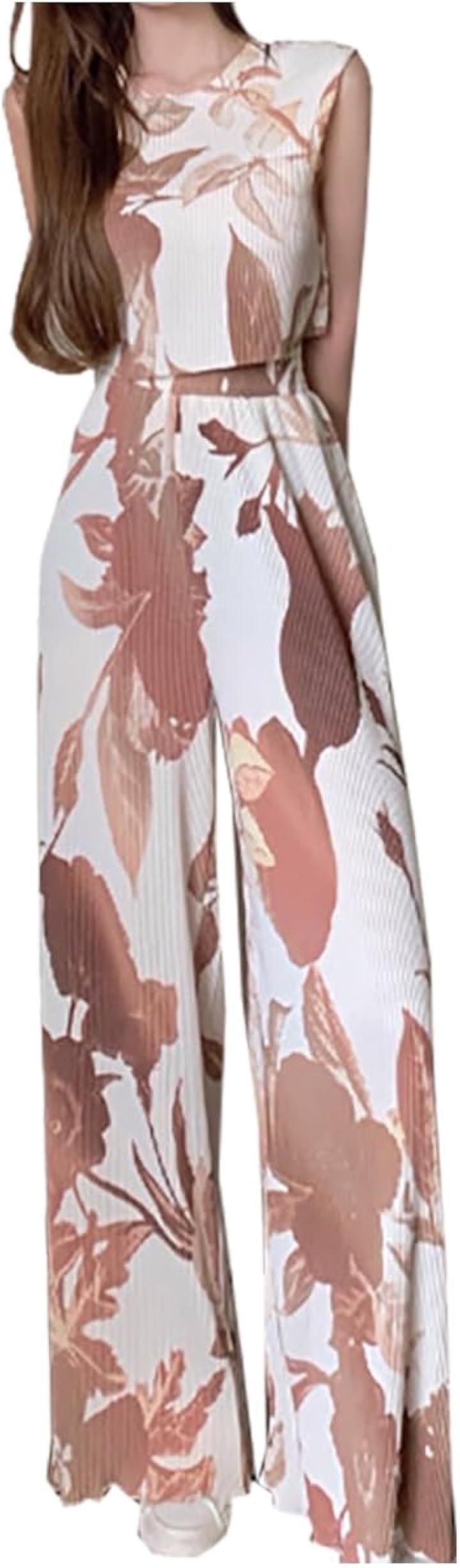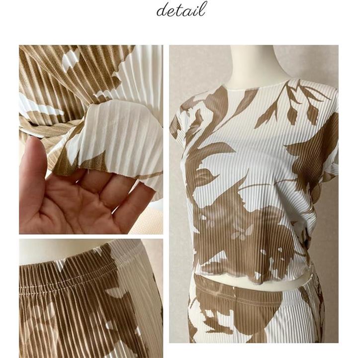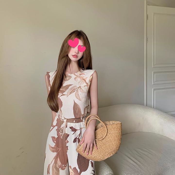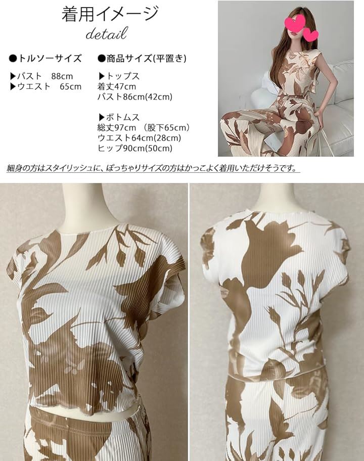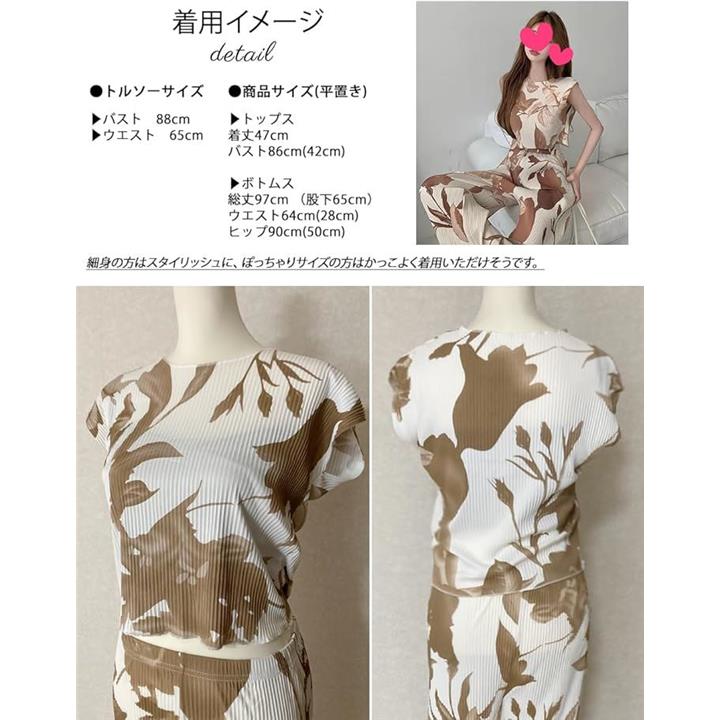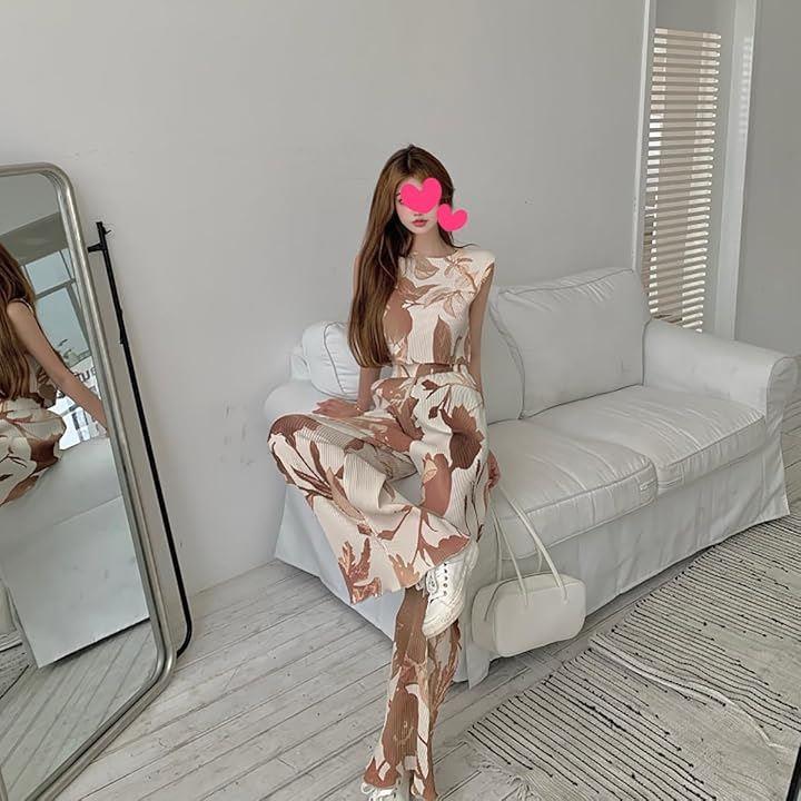 セットアップ レディース 2点セット ノースリーブ トップス パンツ 上下セット 落ち感 ウエストゴム ゆったり 体型カバー 着痩せ お洒落 柄 カジュアル