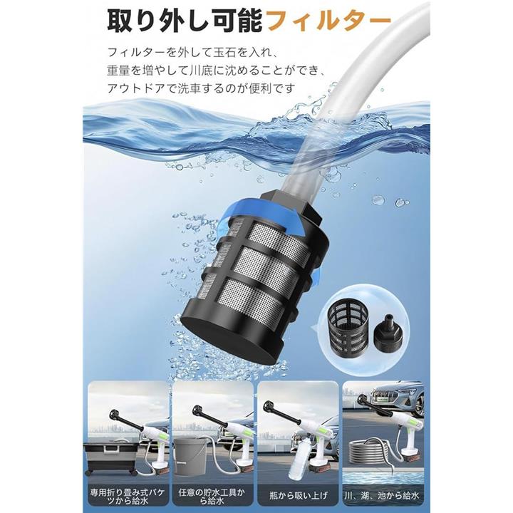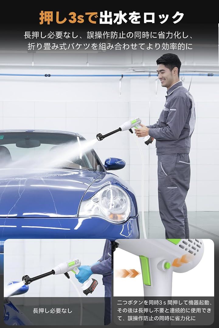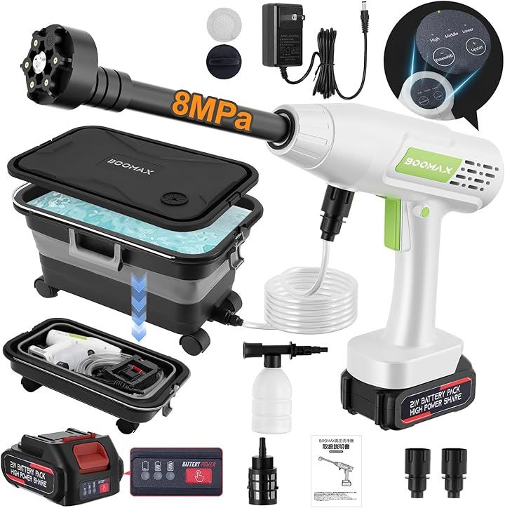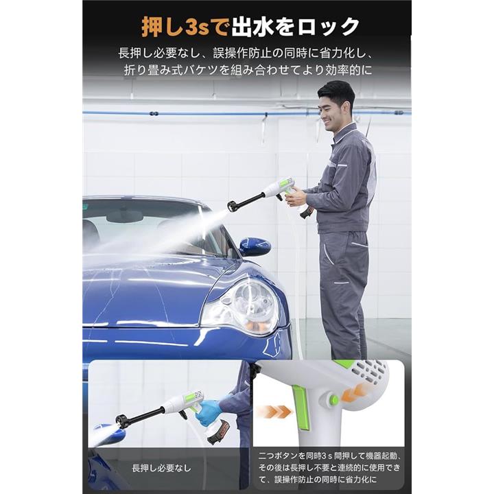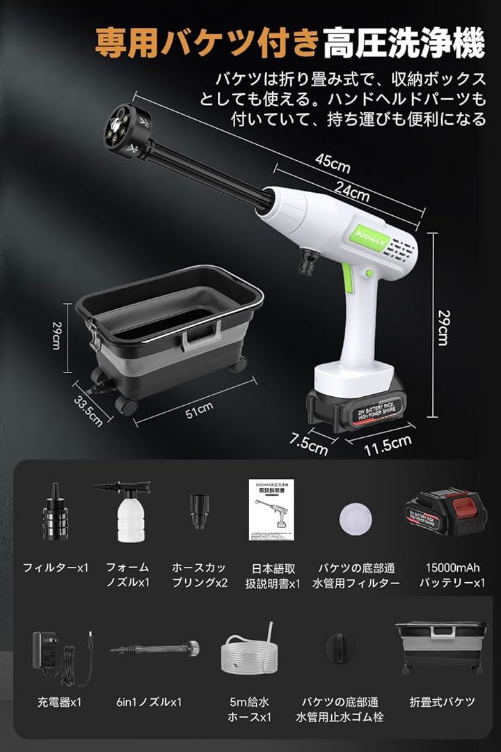 「互換品」Boomax高圧洗浄機 22L折り畳みバケツ付き コードレス高圧洗浄機 USB充電式 水道接続不要 3段階水压モード 約18モード調節可能 安全ロック機能搭載 ボタン長押し不要 6in1多機能ノズル フォームノズル 丈夫なホース 8MPa 噴射距離10M 洗車店監修 |