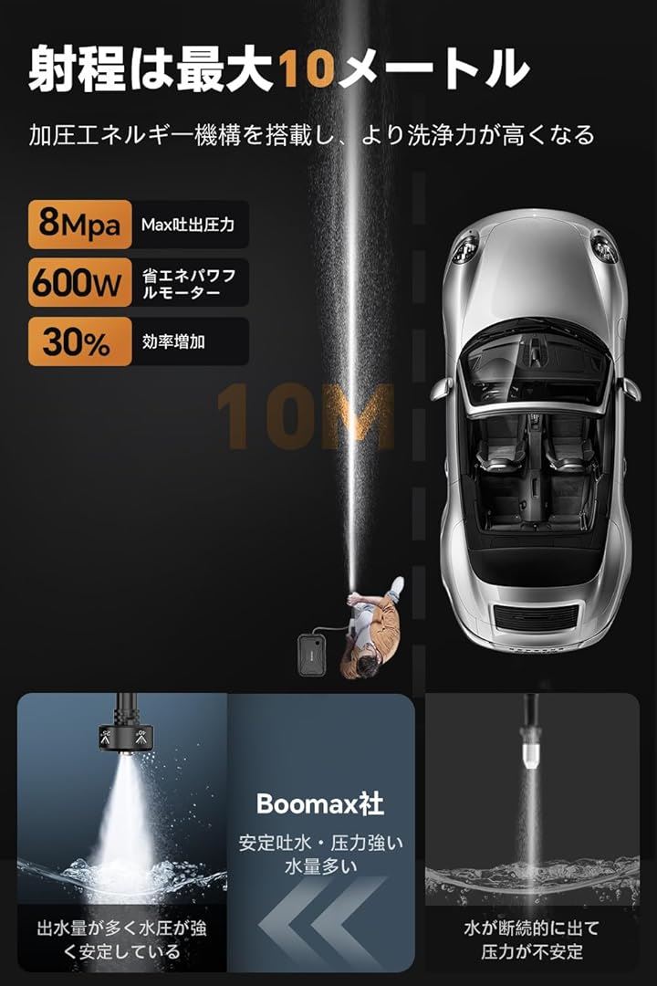 「2025年技術更新 3段階水圧調節可能&洗車や大掃除に便利」Boomaxの高圧洗浄機は(弱・中・強)の3段階水压モードがあり、射程は最大10メートル、強力な水圧によって、長年蓄積したガンコな汚れを落とすことにもできます。