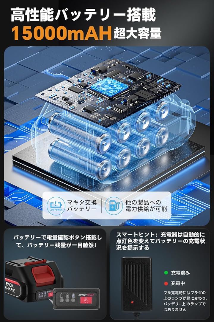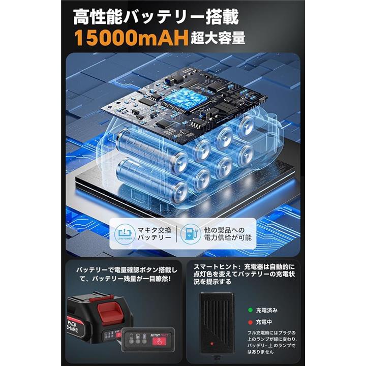 バッテリーは残量確認機能搭載して、バッテリー上のボタンを押して残量が一目瞭然で、作業過程に電力不足になる心配はありません。